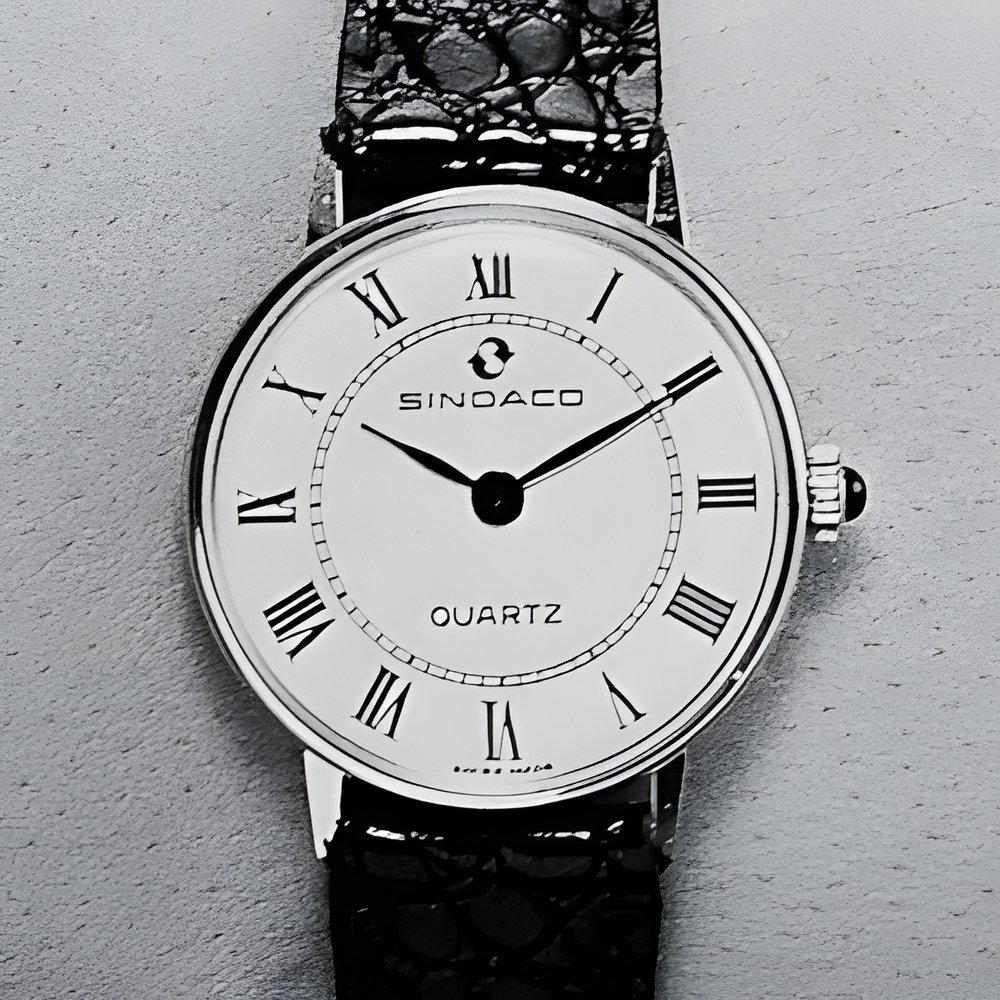 This very accurate and most elegant creation contains one of the newest quartz movements (Ronda 871), of extra-thin, compact dimensions. Very trendy styling : large dial with narrow Roman numerals, traditional minute track, slim case horns and cabochon-tipped crown. (SINDACO)