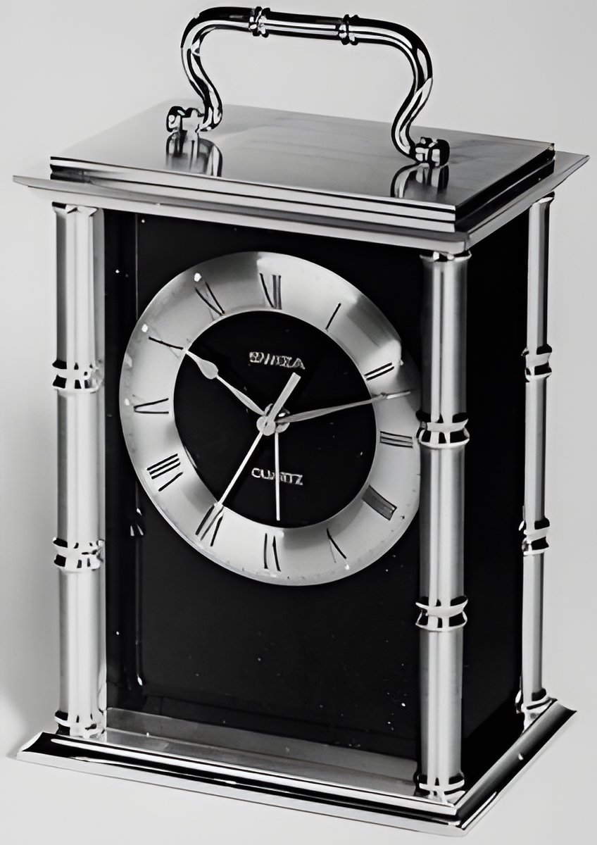 Classically styled table clock with gilded brass case, black lacquered dial with gold-toned bande High-frequency quartz alarm movement. (swlzA Shanghai Collection)