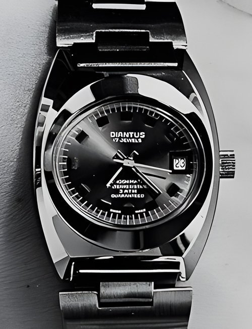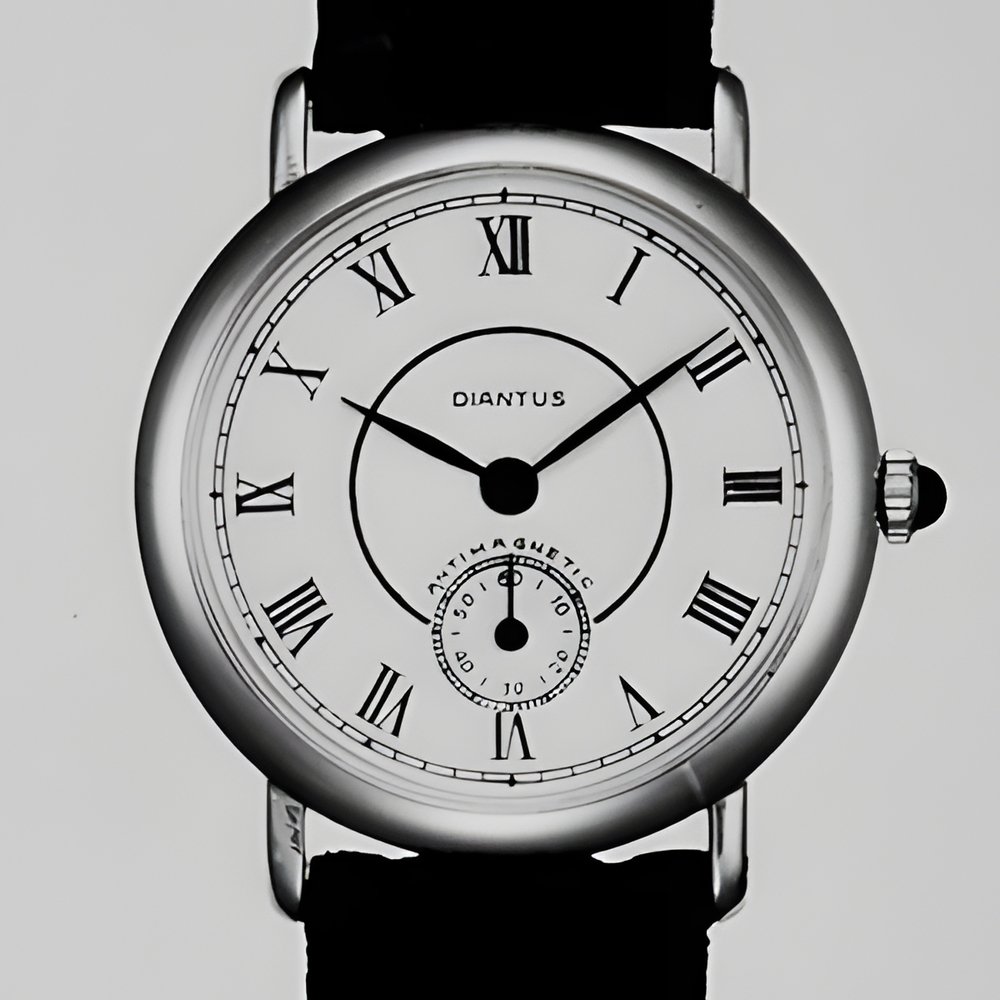 An excellent replica of a turn-of-the-century watch : Roman numerals, minute track and small second hand at 6 o’clock. Chromed case - and very affordable price. (DIANTUS “Nostalgie”)