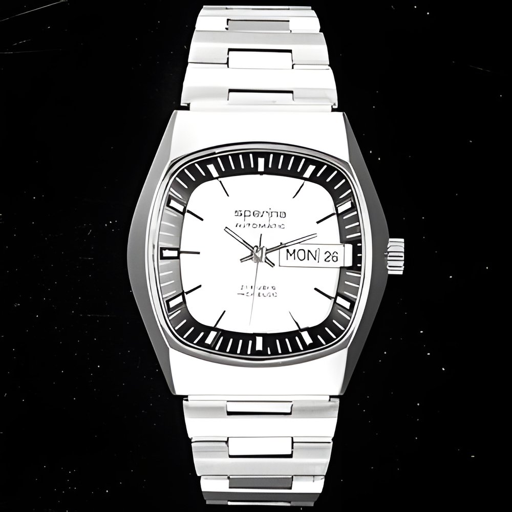 European Watch Clock and Jewellery Fair 1979 IBF 1012 Handsome, with a sporty air - truly a representative man’s watch Selfwinding movement, day and date calendar, water-resistant case. Note the twin-zone dial and very precise minute track. (SPERINA)