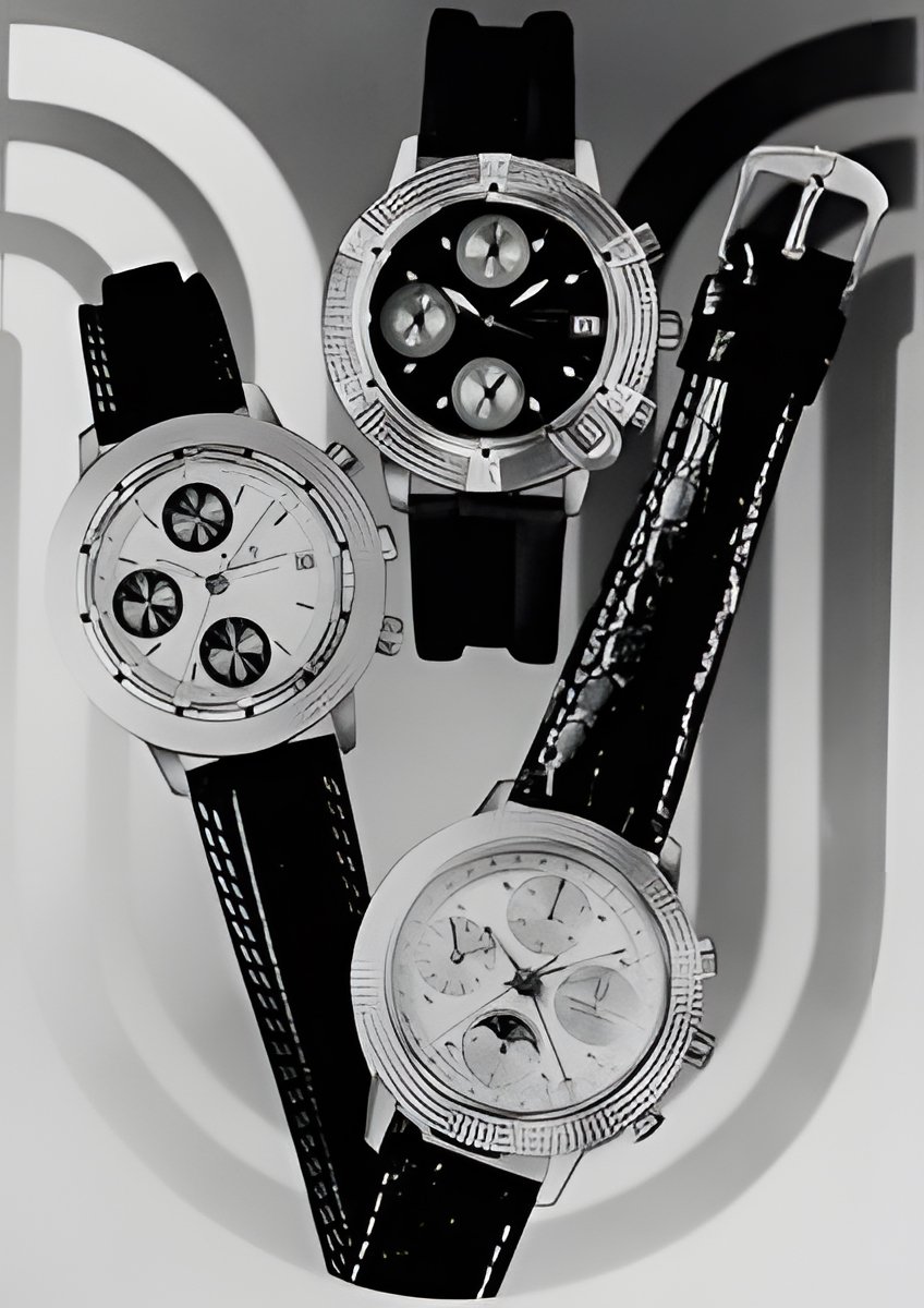 In tribute to the glory of mechanical chronographs, Universal Genève presents its “Chronos” collection. From right to left : “Astrolog”, with automatic movement. Date indication by hand, day, month and moon-phase indications, 24-hour hand. Polished and satin brushed stainless steel case. 18K gold bezel with “Clous de Paris” decor. Water-resistant down to 30 m. Domed scratchproof sapphire crystal. “Aqualog” : automatic movement, tachymetric or pulsometric scale, date calendar, timers for 30 min and 12 hours. 18K gold timer has 60 divisions and markers from 10 to 60. Stainless steel bezel with “Clous de Paris” decor. The “U”, symbol of Universal Genève, forms the bi-directional cursor. Water-resistant to 100 m. Hardened, nonreflective mineral glass. “Aerolog” : stainless steel case and diamond-cut bezel. Automatic movement with traditional chronograph functions : tachymetric or pulsometric scale, date calendar, timers for 30 min and 12 hours. Water-resistant to 30 m. Models are registered by UNIVERSAL GENEVE.