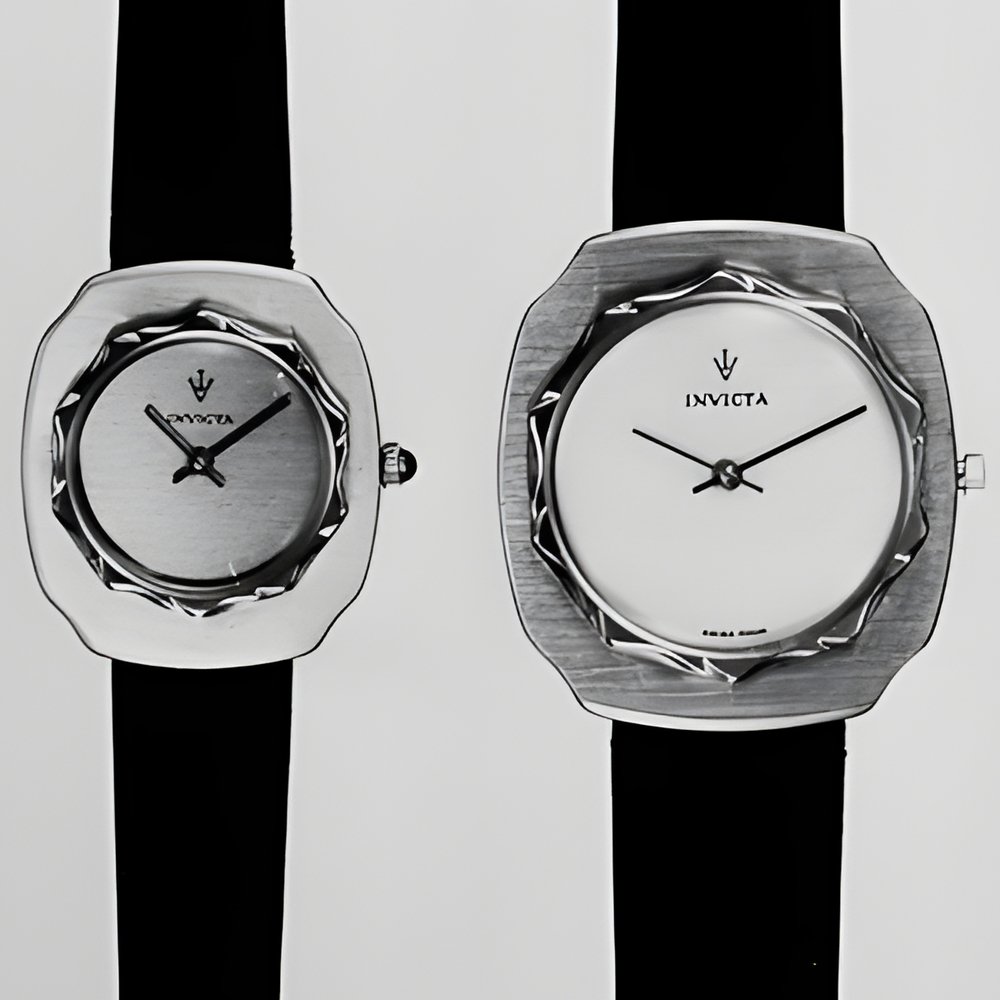 Two-tone His and Hers models with period-style bezel. The case is of white brushed goldplate while the dial is framed in polished yellow goldplate. Unadorned rhodium-plated dial with the same brush finish as the case. (INVICTA)
