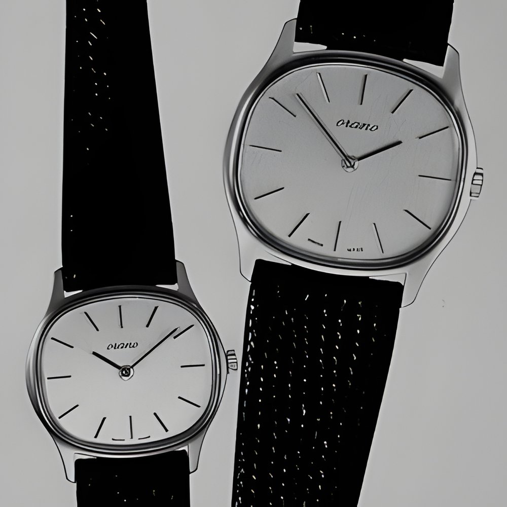 Two elegant models, a man’s and a woman’s, with clean-cut yet softly rounded lines. 10-micron goldplate finish, gilt dial with applied markers. Very thin mechanical movements (ORANO)