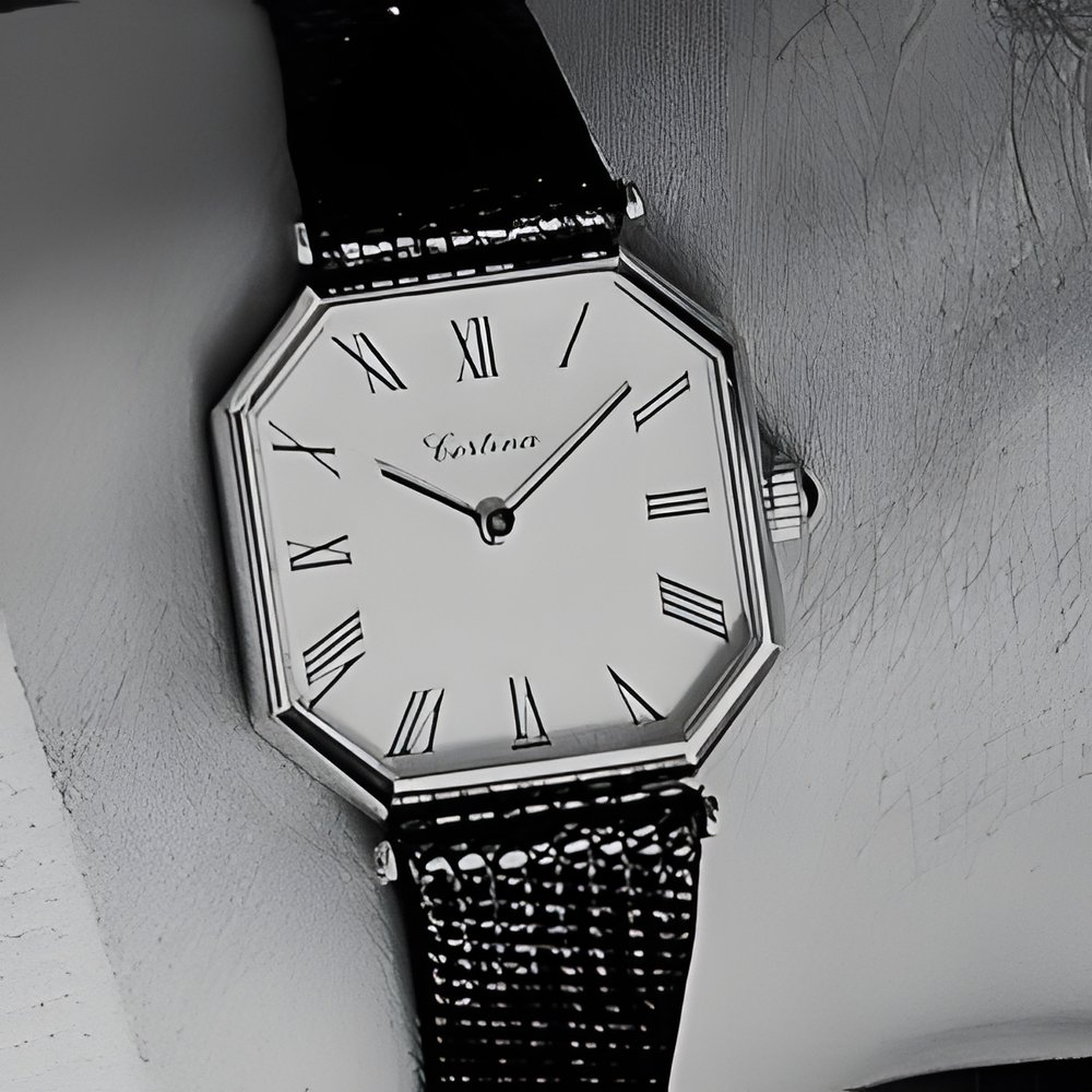 A highly popular style this year : slim, 8-sided case, narrov Roman numerals, cabochon-tipped crown, “stirrup” type links for the strap. The extra-thin case with 20-micron rolled gold finish holds a mechanical or quartz electronic movement. (CERTINA “Caprice”)