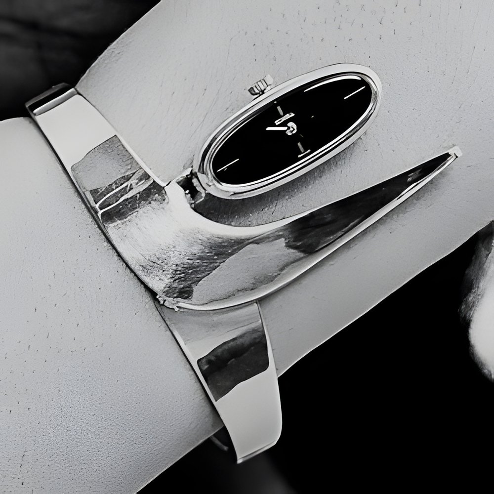 This original set in silver comprises a rigid necklace and an armband watch. Graceful, sleek gloss-polished designs. Note the “baguette” watch’s bold styling. Hand finished. (SCHOLL)