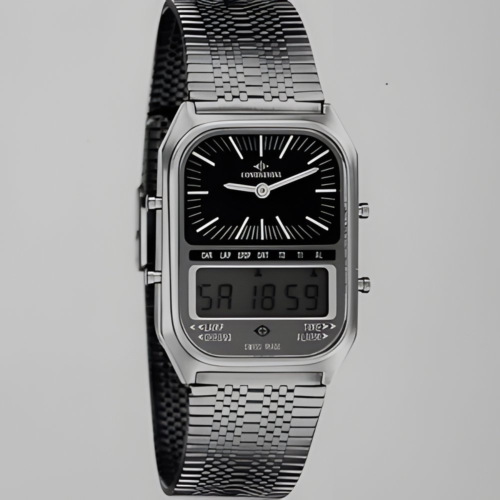 Two distinct displays in the same cases Top : a dial for hours and minutes. Bottom : a 6 digit alphanumeric liquid crystal display showing the day, date and seconds On command, the display shows the time in either of two preprogrammed time zones or turns into a chronograph to the hundredth of a second, with “flyback” and other features, and 24-hour capacity or, if desired, the time at which the built-in alarm is sete A “Flag” indicator tells the wearer which mode his watch is in and the display “blinks” to warn him of waning battery power. (CONTINENTAL)