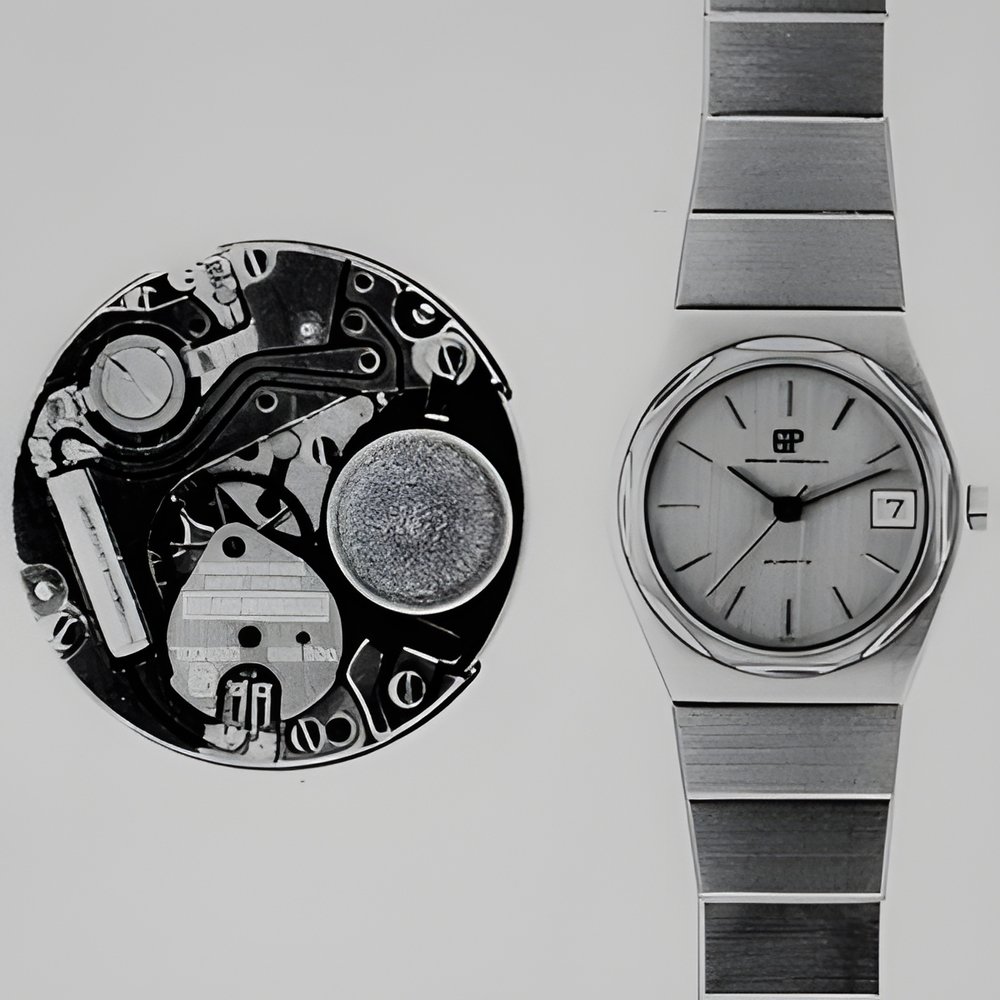 Enlarged view of Girard- Perregaux’s new GP 700 analogue quartz movement, now made in the company’s own workshops. 21-50 mm in diameter and 4.20 mm thin, with or without centre second hand, calendar. The new movement equips the all-steel, water-resistant watch with integrated bracelet shown alongside. (GIRARD-PERREGAUX - GP 700)