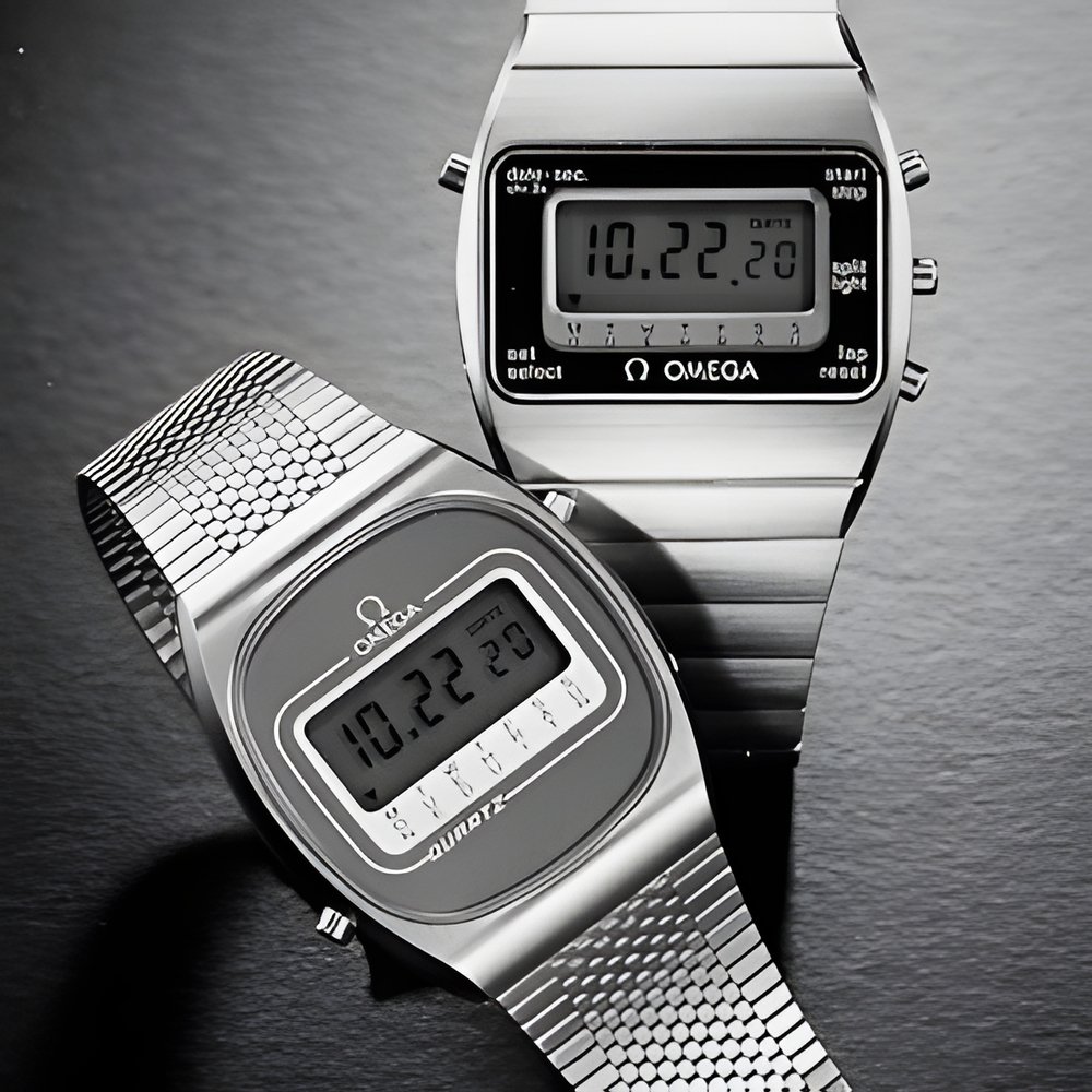 New Omega LCD digital designs : 6 functions, programmed calendar, nightlight, case water-resistant to 30 m, tempered mineral crystal. Also available in Speedmaster chronograph version, with full range of short-time measurements to the 1/100th second for up to 24 hours ; water-resistant to 30 m, tempered mineral crystal. (OMEGA - Quartz LCD)
