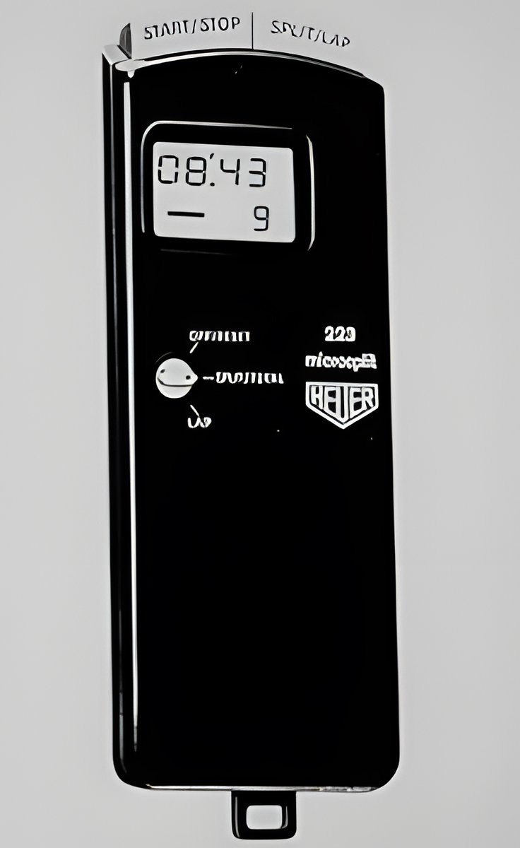 Industrial electronic stopwatch, with liquid crystal display (LCD). Measures times in hundredths of a minute (decimal units), split-second and Taylor functions, Shows total times after multiple, successive measurements. Total timing capacity : 9 hours 59.99 minutes. High impact plastic case,with neck-cord. (HEUER - 223)
