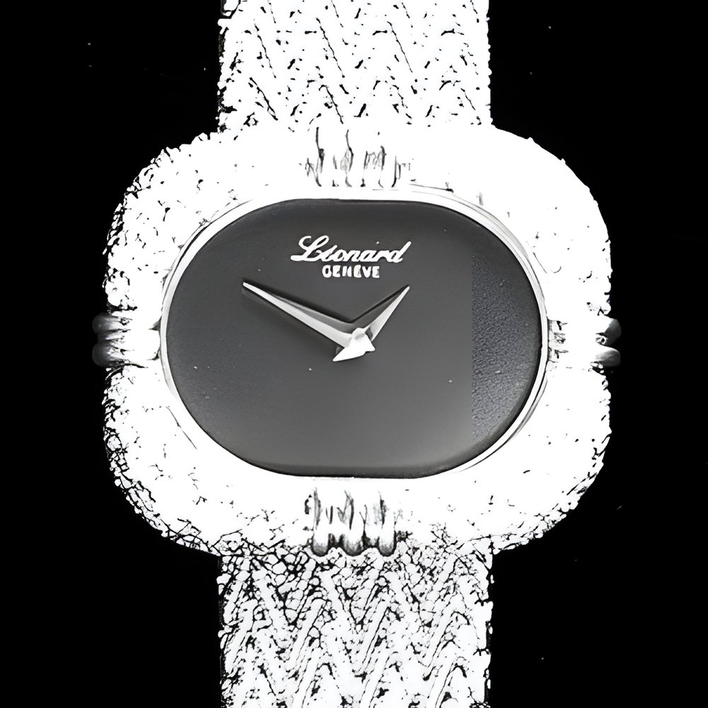 Classic and contemporary styling blend elegantly in this “Jacinthe” model by Léonard. In 18K yellow gold, with case entirely set with diamonds and godroons marking the quarters. (LEONARD, Geneva)
