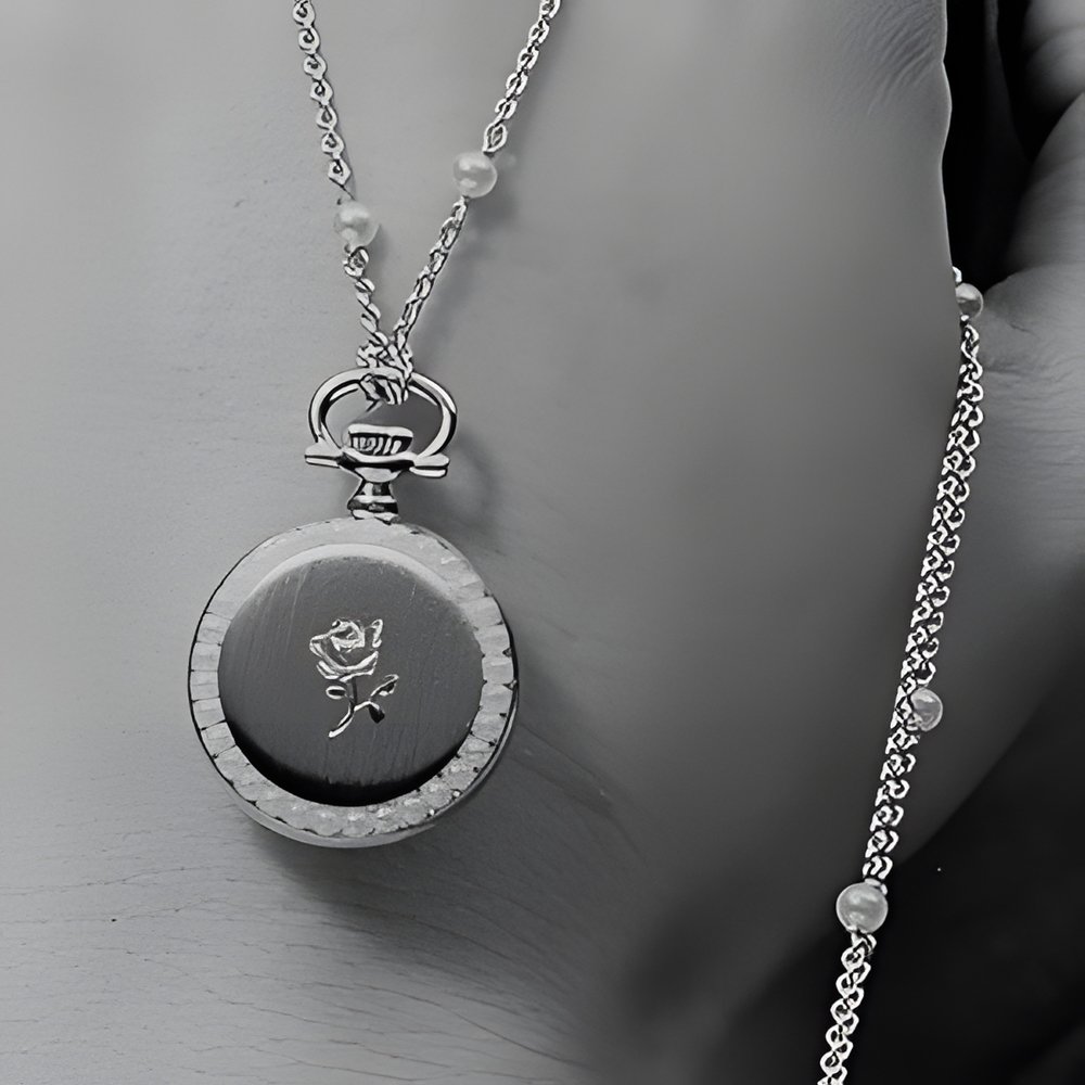 Graceful pendant watches remain very much in vogue. This classic design features a goldplated case with enamel-like finish enhanced by imitation pearls. Choice of mechanical or quartz movement. (BERNEY-BLONDEAU, L’Abbaye)