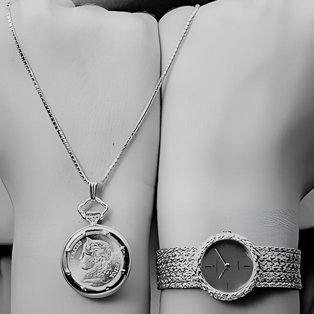 Two new Golana models introduced at the 1979 Basle Fair : 18K yellow gold wristwatch with champagne dial, sapphire crystal and bracelet with very original structure; the movement is an extra-thin 7 3/4“Flatline quartz. The pendant-watch’s caseback features a Swiss”Vreneli" gold coin (or a coin from another country) set in such a way as to retain its full value. With quartz or hand-wound movement. (GOLANA)