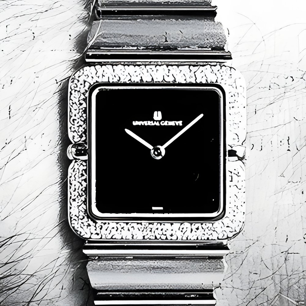 From Universal-Genèves new jewellery watch collection, a prestigious masculine model : 10K yellow gold, case set with 105 diamonds, two-colour bracelet in white Lnd yellow gold with broad rounded linkse Onyx dial. (UNIVERSAL-Genève)