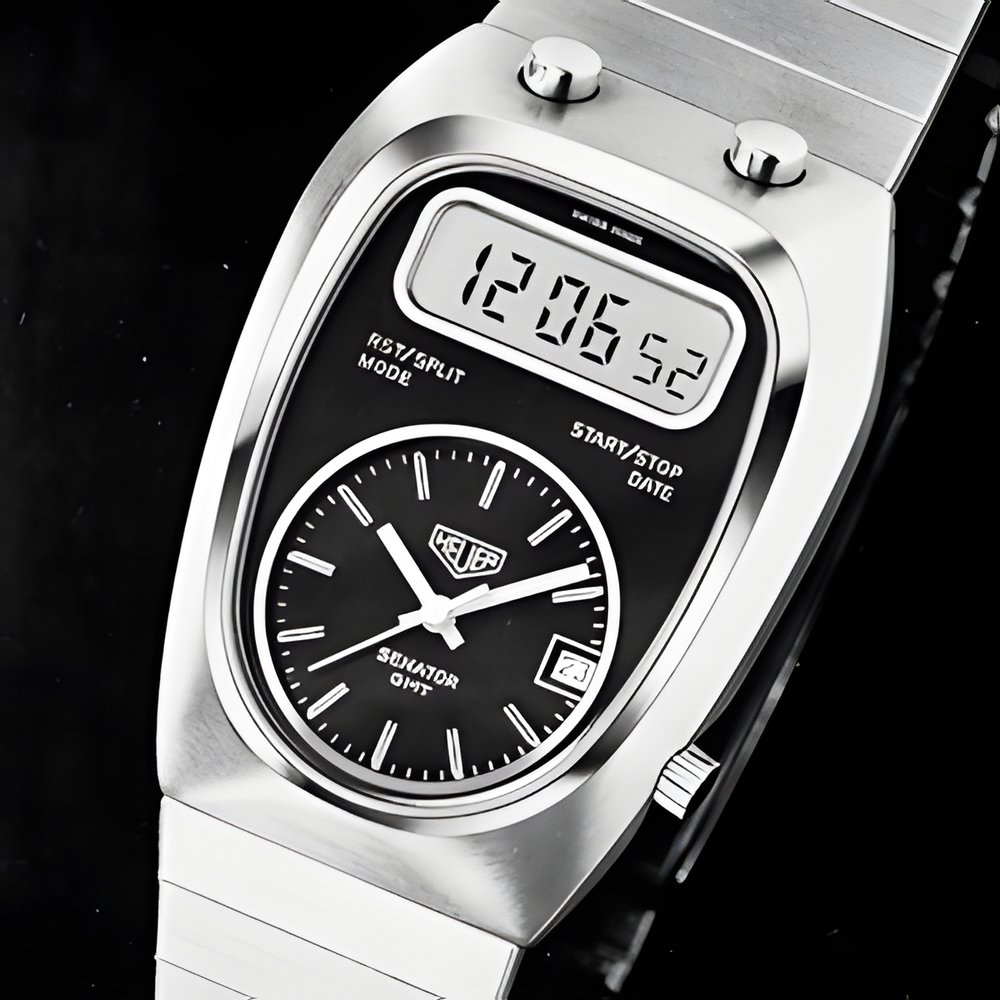 New double-display design by Heuer : LCD digital above, analogue below. The digital display can be made to show the time in another time zone or GMT. It also has stopwatch features including intermediate time storage. The analogue face includes a centre second hand and a calendar. All-steel or goidpiated water-resistant case. (HEUER “Senator GMT”)