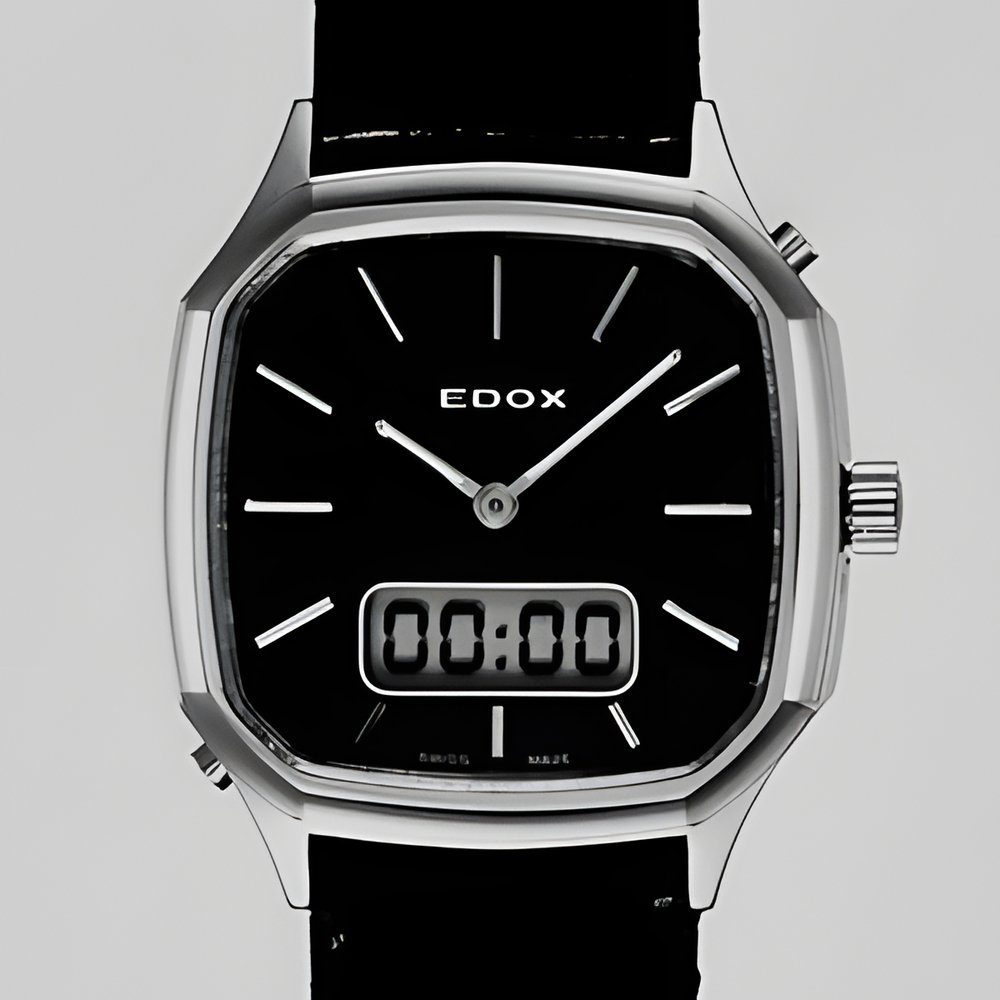 The double-display analogue-cum-digital quartz watch is a Swiss speciality. This Ed.ox model features a crisply styled case Its slate grey dial has a wide aperture showing the date and seconds or, at the touch of a button, a stopwatch readout. (EDOX)