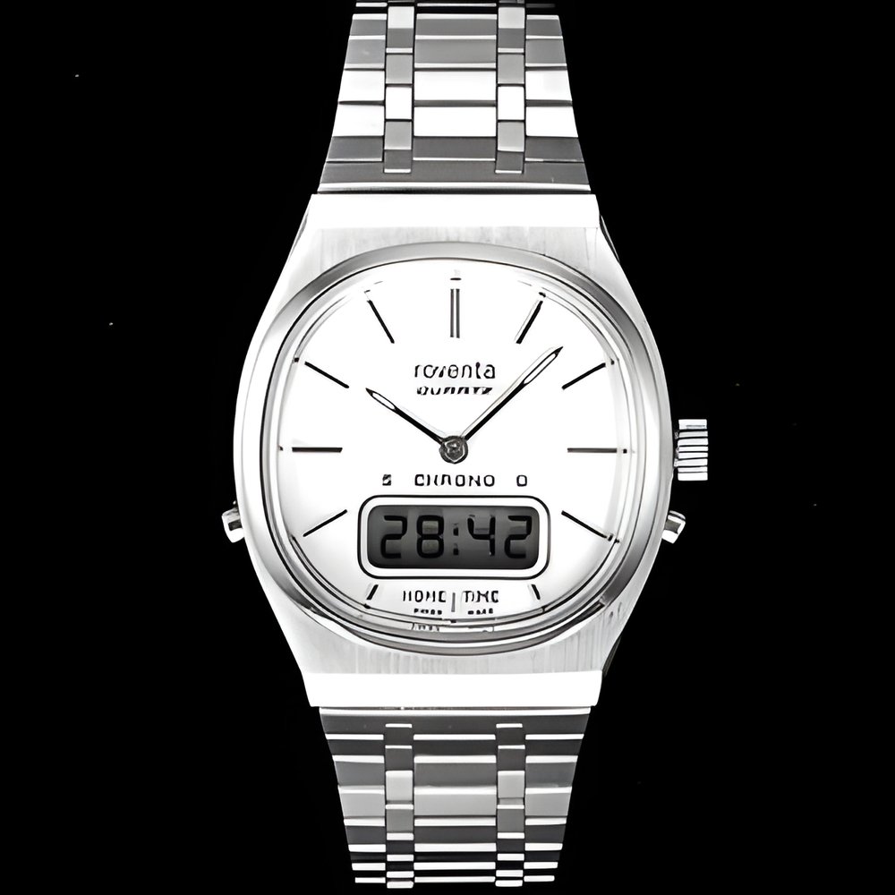 Hours and minutes read at a glance with a classic dial and hands, liquid crystal (LCD) readout of the seconds and the date in an aperture in the dial replaced, at the press of a button, by a stopwatch readout (minutes and seconds then hours and minutes to 23:59) or a second time-zone indication. Elegant, practical and precise, this type of watch embodies the latest in horological technology. (ROVENTA-HENEX)