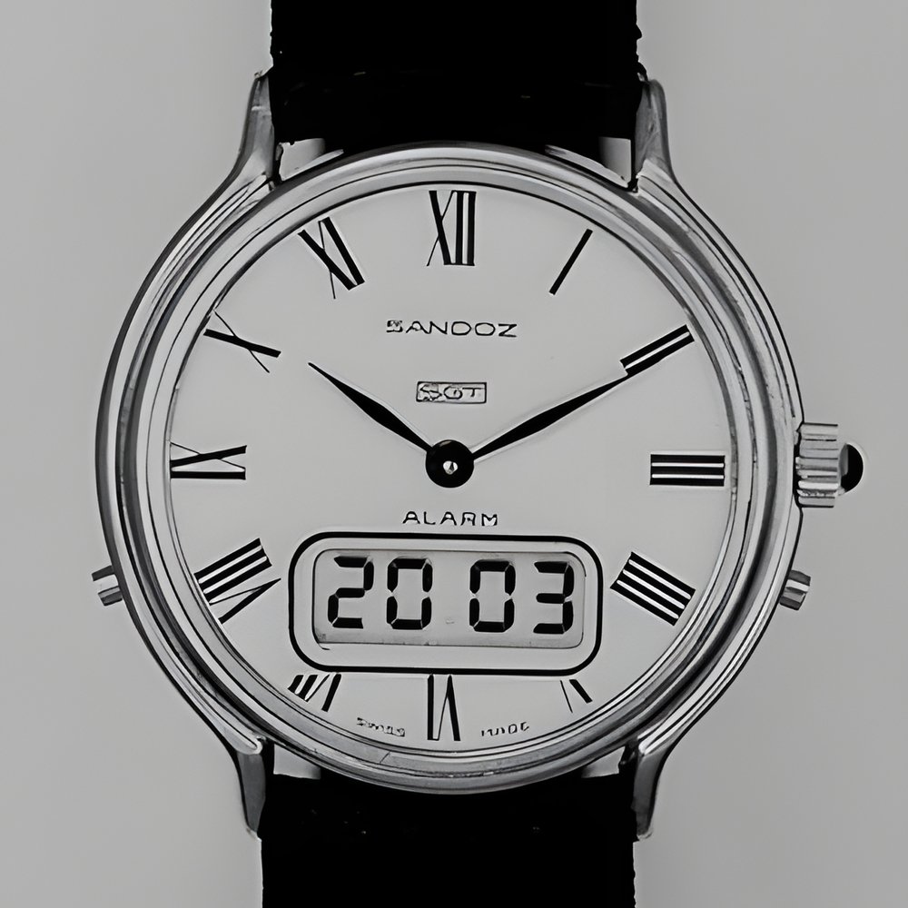 Analogue /digital combined-display model from Sandoz Hours and minutes are shown by hands against a classic dial while the seconds and date appear as liquid crystal figures in an aperture which also serves to set the alarm which features a modulated tone Nostalgic “Retro” styling for the goldplated case fitted with a matt-white dial bearing Roman numerals. (SANDOZ)