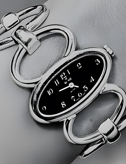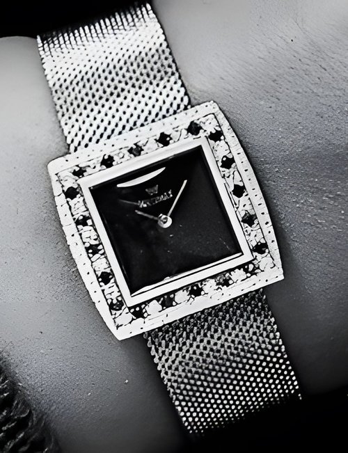 High fashion jewellery watch in the “soft look” styling trend. It is in 18ct grey gold and the gently curving lines of the case are emphasised by the diamonds studded around the dial. A continuous (without spaces between the links) bracelet, diamond-engraved. (PRECIMAX)