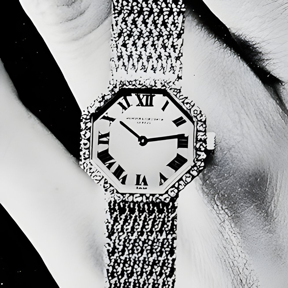 “Belle Epoque” (early 1900’s in feel) watch styling from Switzerland. This octagonal watch has a very white dial on which larger than normal Roman numerals stand out, following the facets of the case, and studded with diamonds. The extra slim bracelet is made up of minute links of interlaced grey gold. (VACHERON & CONSTANTIN)