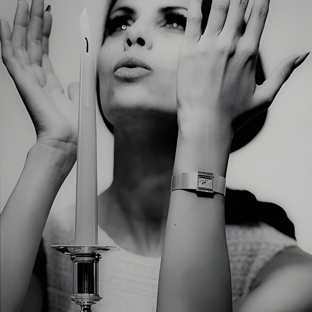 A resolutely square, modern feeling about this new fashion watch from Switzerland. The rectangular watch is set into a wide bracelet, closely meshed in 18 ct. gold. The dial has the same texture - and it has neither figures nor index markers. Final luxury touch: ten baguette-cut diamonds on each side of the case. (CORUM)