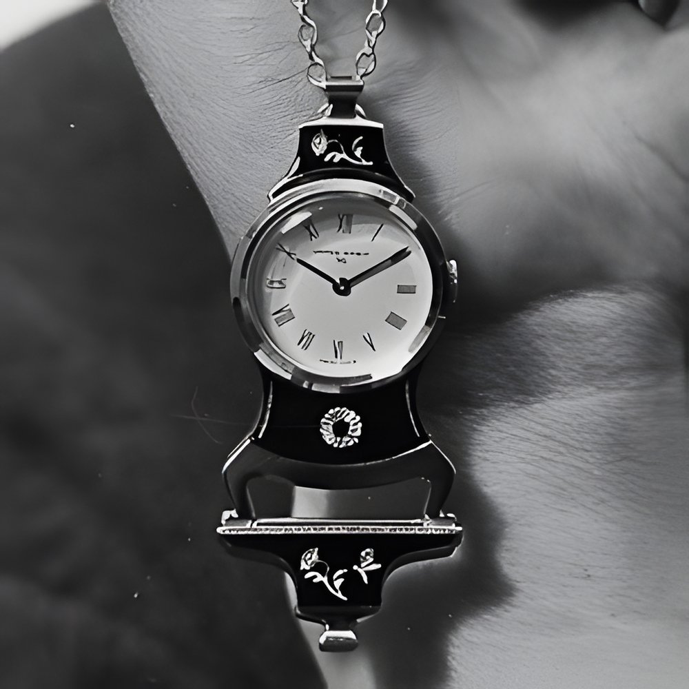 The pendant-watch remains a favorite. This original model, in the form of a Louis XV clock, can also be used as a bedside clock, the base swinging to form an appropriate foot. (UNITED ORBIT)