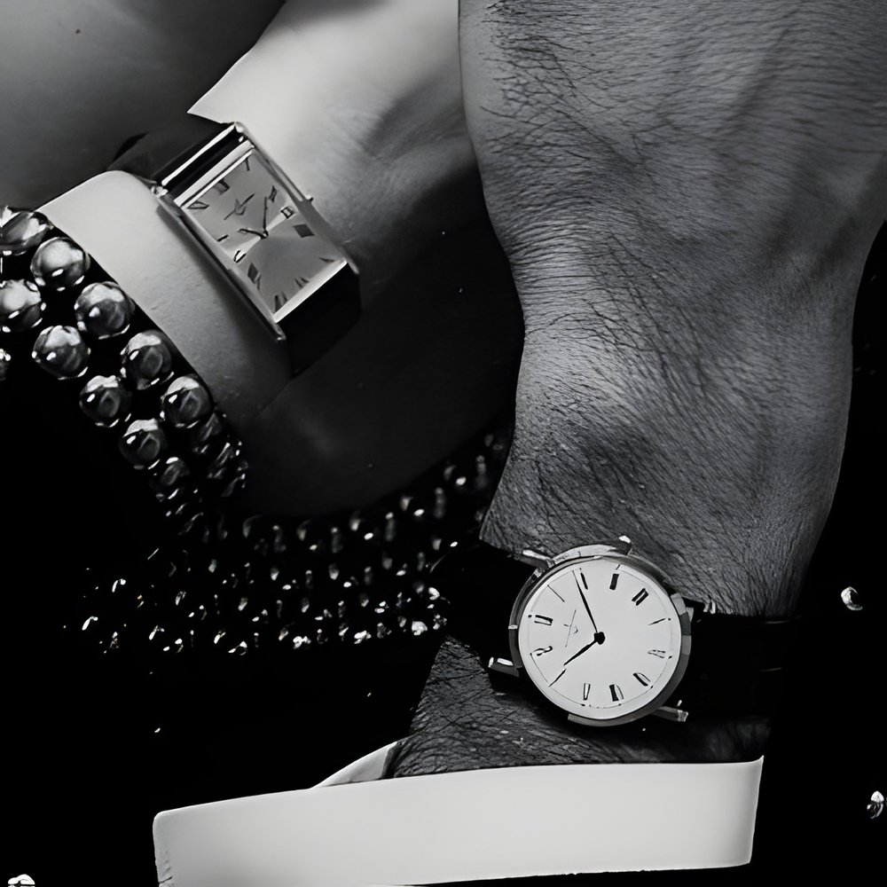The “Belle Epoque” watch is currently very much in style. Ulysse Nardin presents two models in 18 ct. gold. Hers is of generous proportions with a rectangular case; the gilded dial is graced by Roman numerals. His is round with a silvered dial and Roman numerals. Set in the winding-crown is a cabochon sapphire. The trend is definitely to larger ladies’ watches while men’s watches tend to get smaller. (ULYSSE NARDIN)