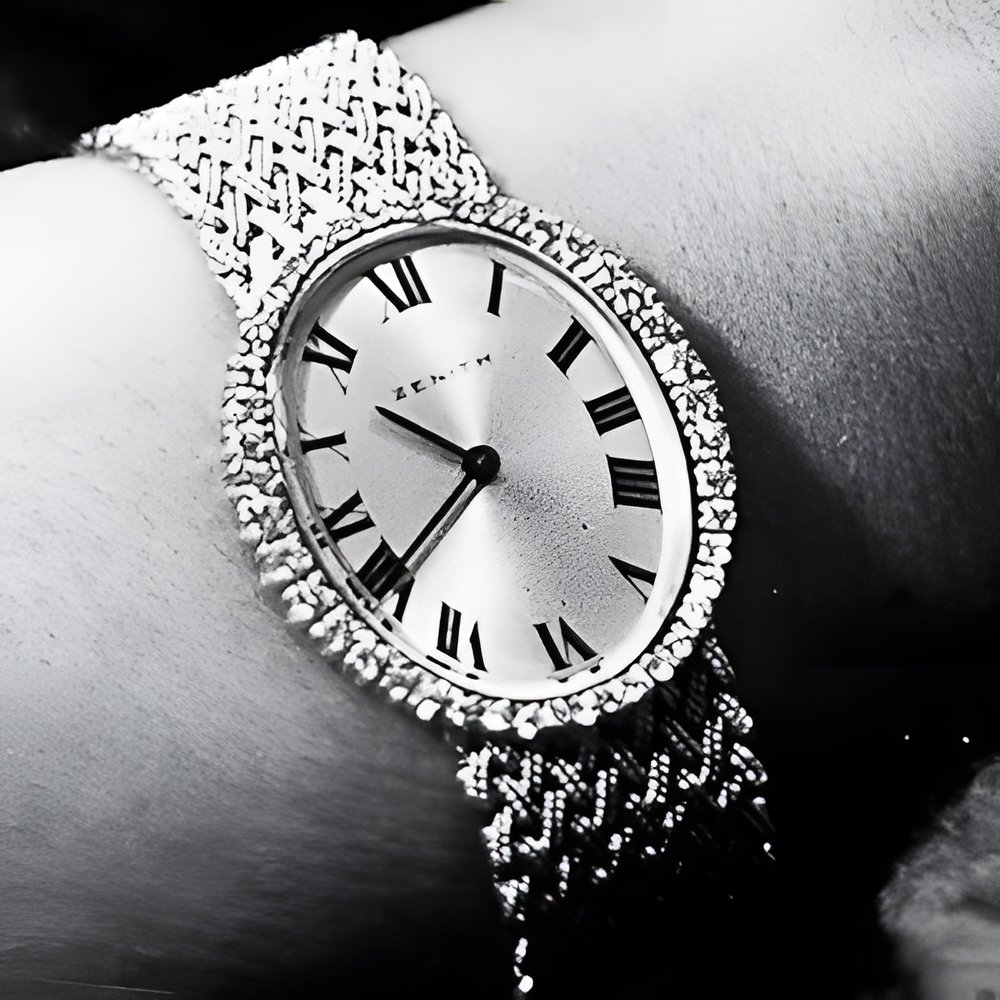 All the ingredients of today’s styling highlights - the “Belie Epoque” style large oval case, Roman numerals on the dial and wide, flexible bracelet. In 18 ct. grey gold. Brilliants set on the case underline its graceful oval lines. (ZENITH)