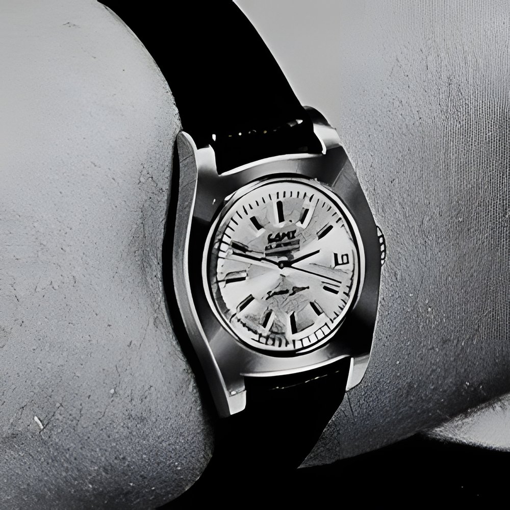 An elegant self-winding sports watch with calendar and centre seconds-hand. Its “cushioned-square” all-steel case is, naturally, both waterproof and shock-resistant. (CAMY)