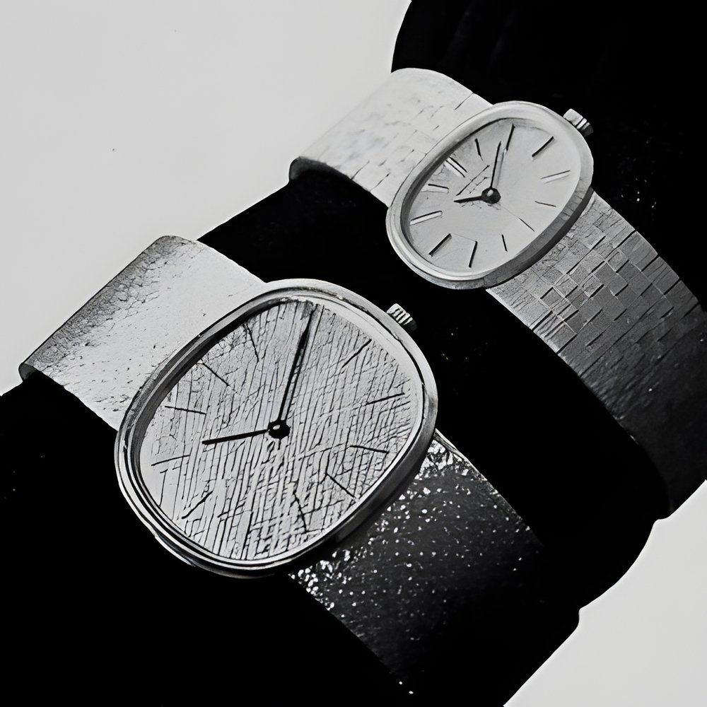 A new approach to the ’soft-line“school of watch styling so much in vogue today: the”Golden Ellipse" watch in the form of a double ellipse. Except for dimensions, the same model for him and for her. With an intergrated bracelet whose motif’ also graces the dial. In 18 ct gold. (PATEK PHILIPPE)