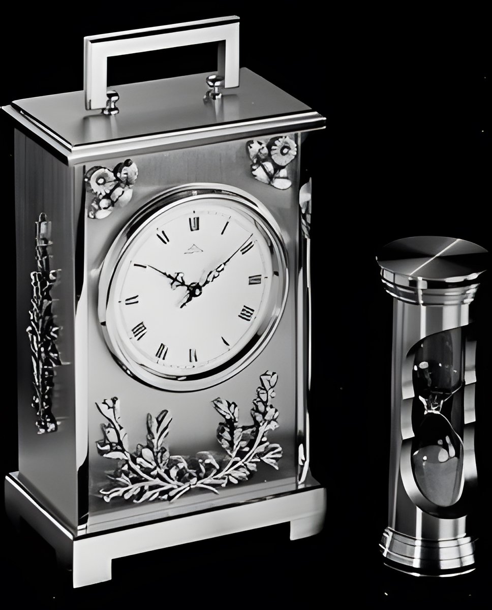 A small table clock, decorated with applied motifs in cast bronze. It may be fitted with an 8-day movement or an electric movement. The egg-timer demonstrates its compact dimensions. (PONTIFA)