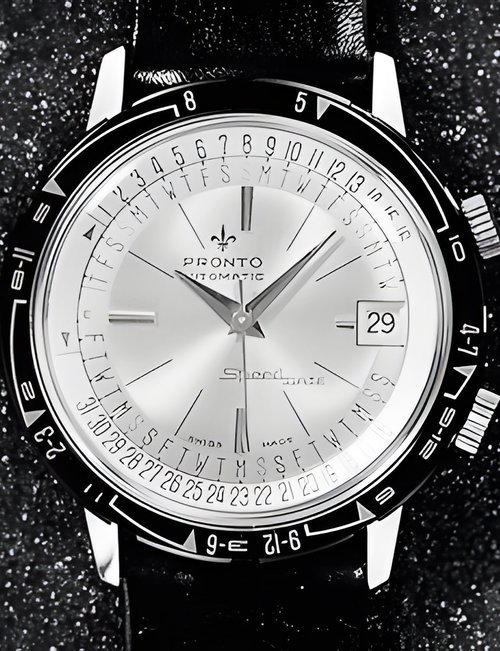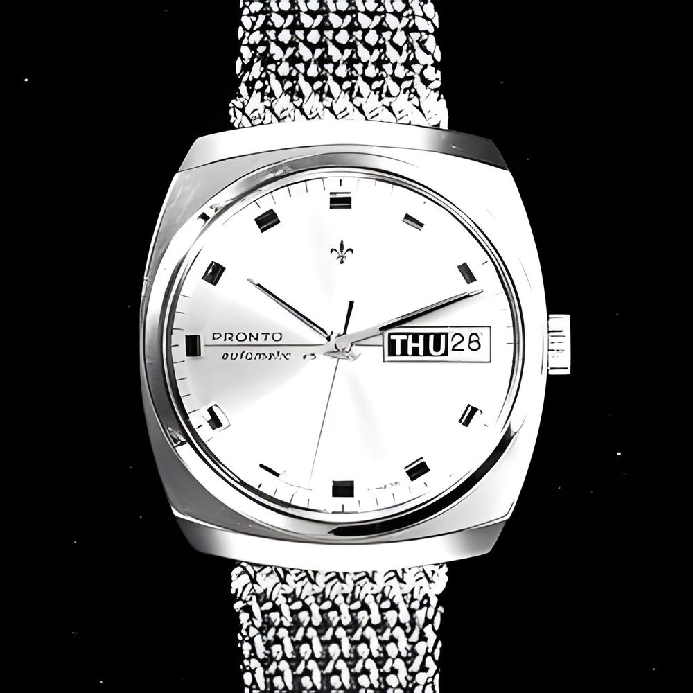 This model embodies many of the characteristics of this year’s man’s watch. First the “day-and-date” calendar, then the soft lines of the cushioned-square case, finally the absence of horns. Note the elegant integration of “woven” metal bracelet and case Self-winding, with water-resistant case. (PRONTO)