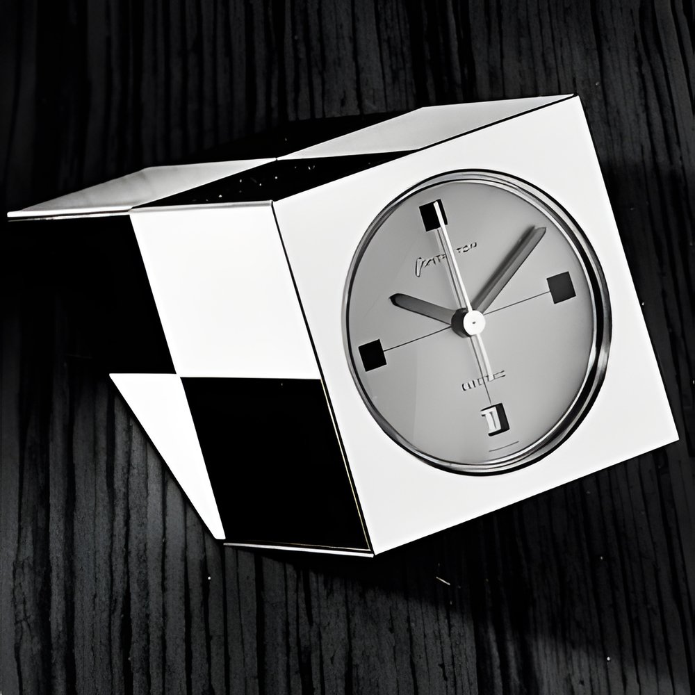 Small ’lop art" table-clock. Electric, battery-powered movement Black and white chequered squares With calendar and centre seconds-hand. (CONTACTOR)