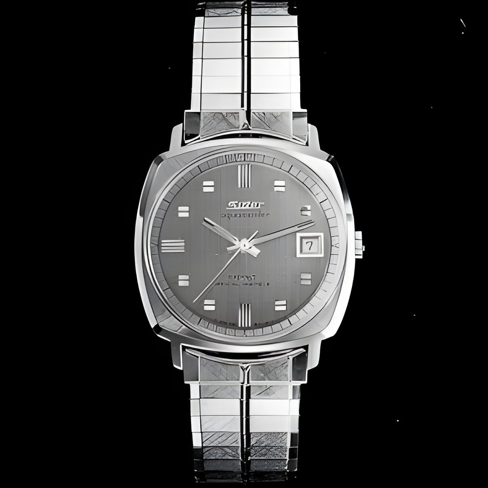 In order to suppress all humidity and prevent condensation, a vacuum has been created inside this watch’s water-resistant case. Water-resistance guaranteed to 5 atmospheres. Self-winding, quick-beat movement, calendar, scratch-proof crystal. Minute-circle on the tension ring. Official Montreal Expo 67 watch. (SUTER-HAFIS “Aquamaster”)
