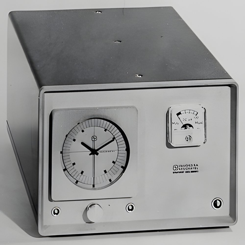 This portable electronic quartz clock is both extremely precise and of compact size, having a 0.001 second daily variation rate. Its small size (5 dm 3 ) is remarkable. Equipped with thermo-static circuit. For use in geodesic work and for research etc. A model of this type set the absolute record for precision in its category at the 1966 Neuchatel Observatory contests (EBAUCHES S.A. - Oscilloquartz)