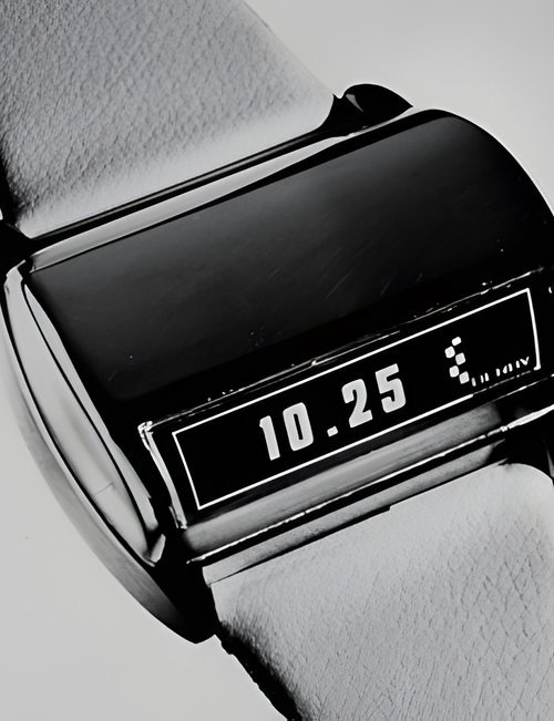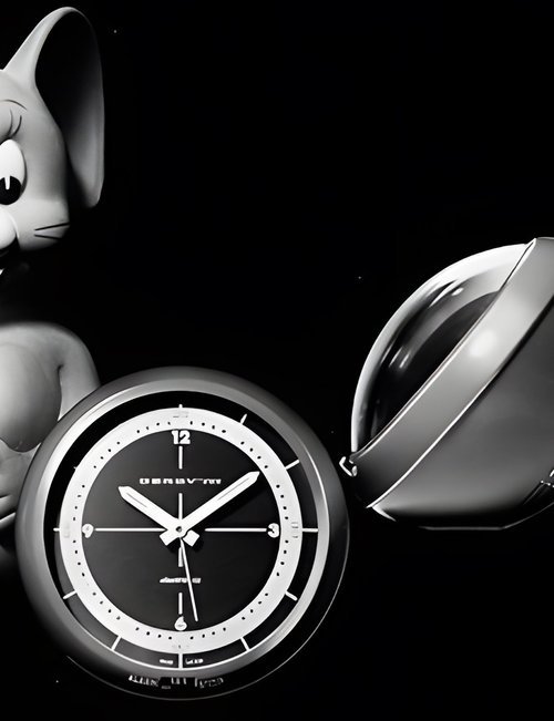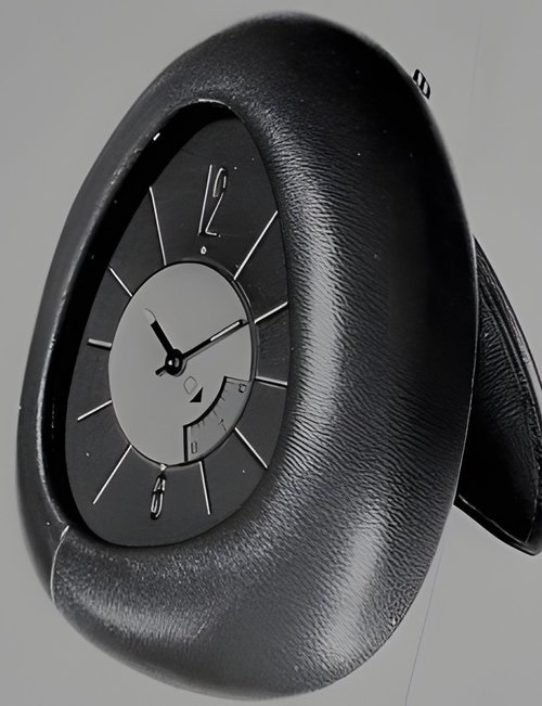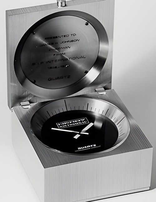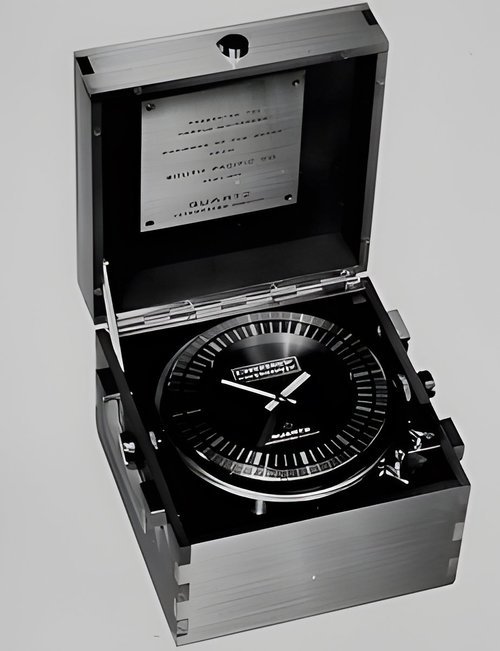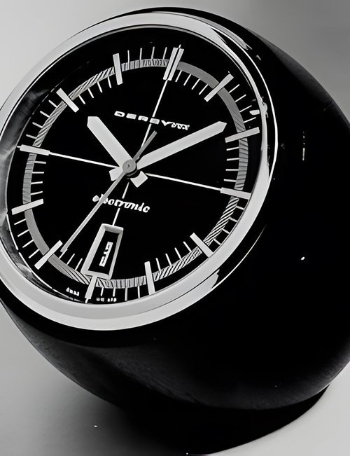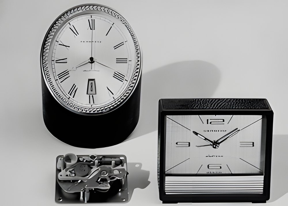 Both these small table-clocks are driven by a novel battery-powered electronic movement fitted with shock-absorber. On the left: with center seconds-hand and calendar. On the right: alarm-clock with electronic sound signal modulated by the balance-wheel and transmitted by a miniature loudspeaker (sound signal lasts 1 minute). (DERBY-Vox)