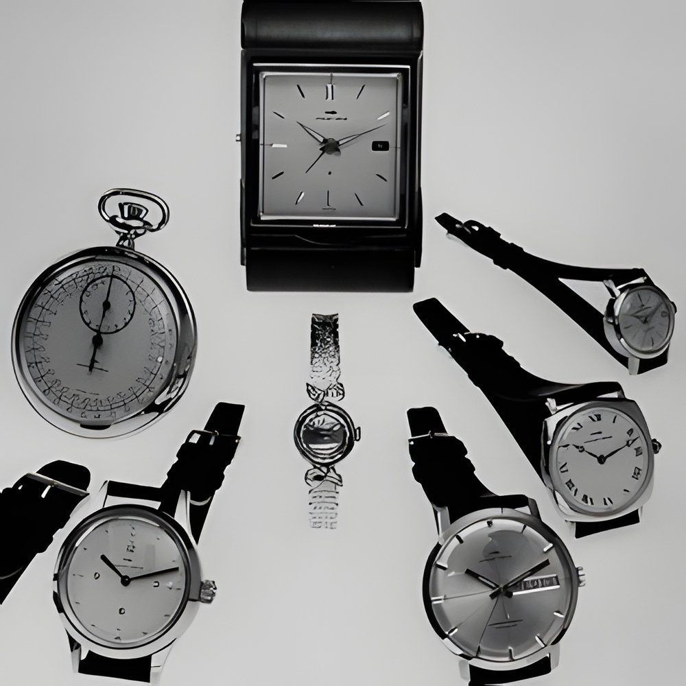 A sample of the wide ranne of timepieces produced by JaquetDroz, who offer over i 000 different models. The timer, the underwater chronograph and the blind mi’ s watch are example of the ’technical’’ line. The rich variety of dress, sports or evening watches is represented here by a jewellery-watch, a self-winding watch with day-and-date calendar, an ’1extra-slirn" watch and a ladies’ self-winding calendar-watch. The travelling alarm-clock with 8-day movement features a calendar. (JAQUET-DROZ)