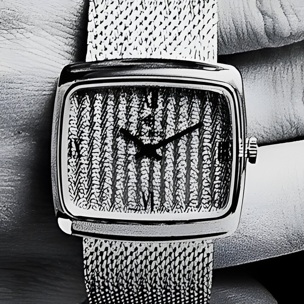 A pair of very stylish watches with flow-through bracelet whose motif is reproduced on the dial. The return of straight lines is obvious here, tempered by a gouged bezel contributing to these models’ ultra-flat look. In rhodium plate or goldplate. This model is automatic.