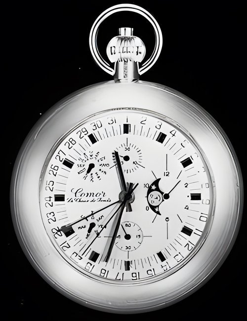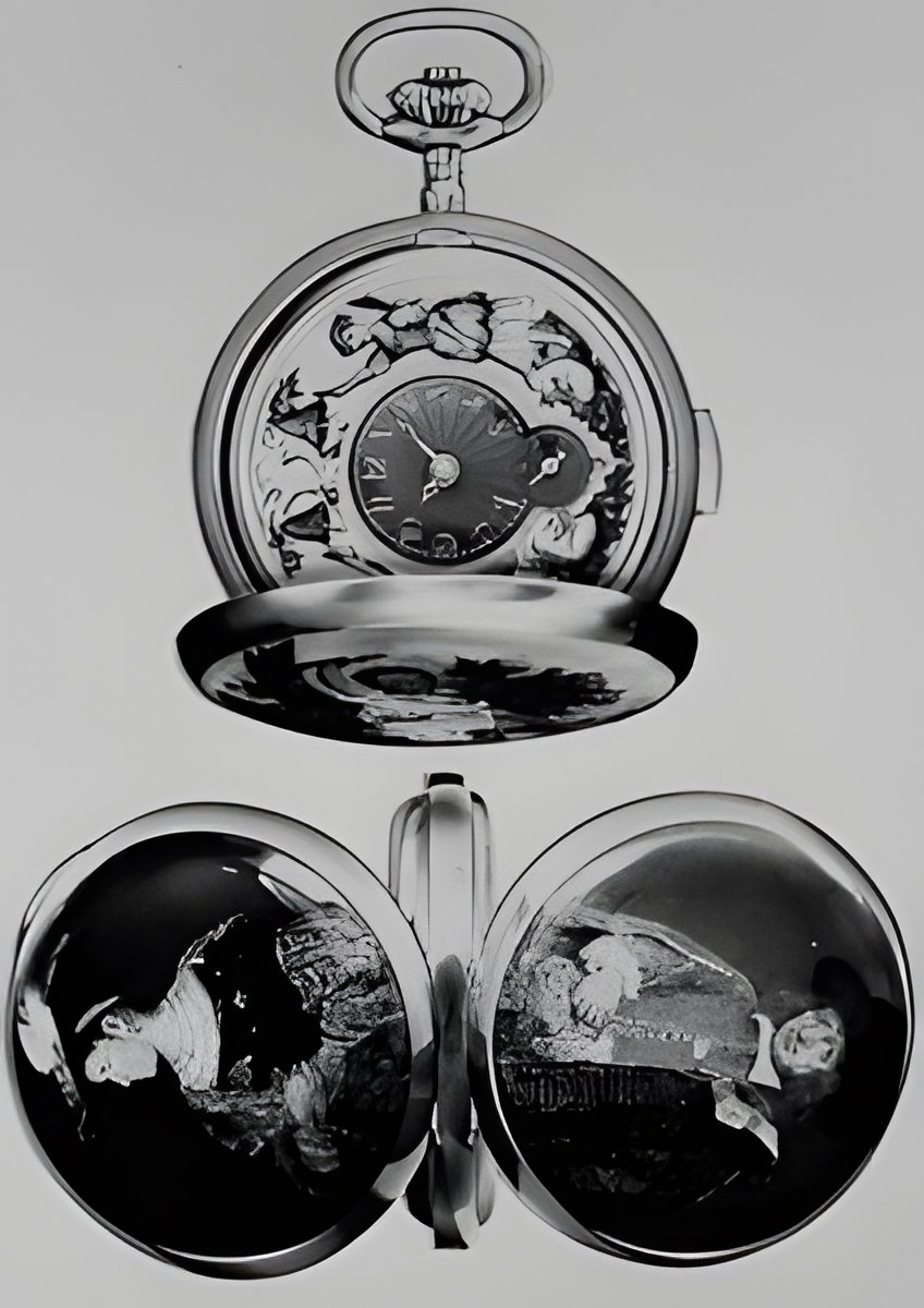 When this repeater watch rings the hours, the two enamel figures (called “Jacks”) strike the bells above the dial. This replica of an antique masterpiece is in 18 carat gold and its two domes feature scenes painted in genuine enamel. Strikes hours and, (C0MOR- La Chaux-de-Fonds)