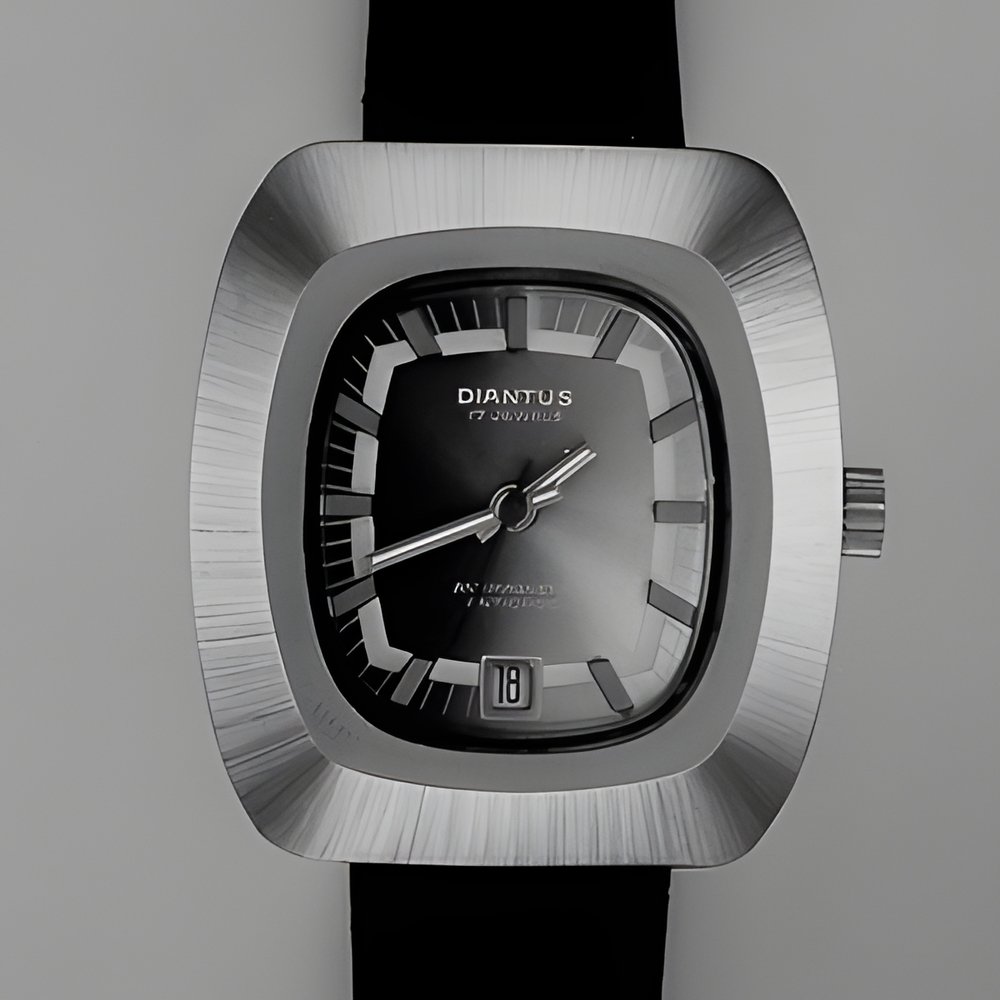 While this watch does have a broad case, its overall styling - slightly rounded lines and blue coloured dial - is quite trendy. An economical model, with calendar. (DIANTUS)