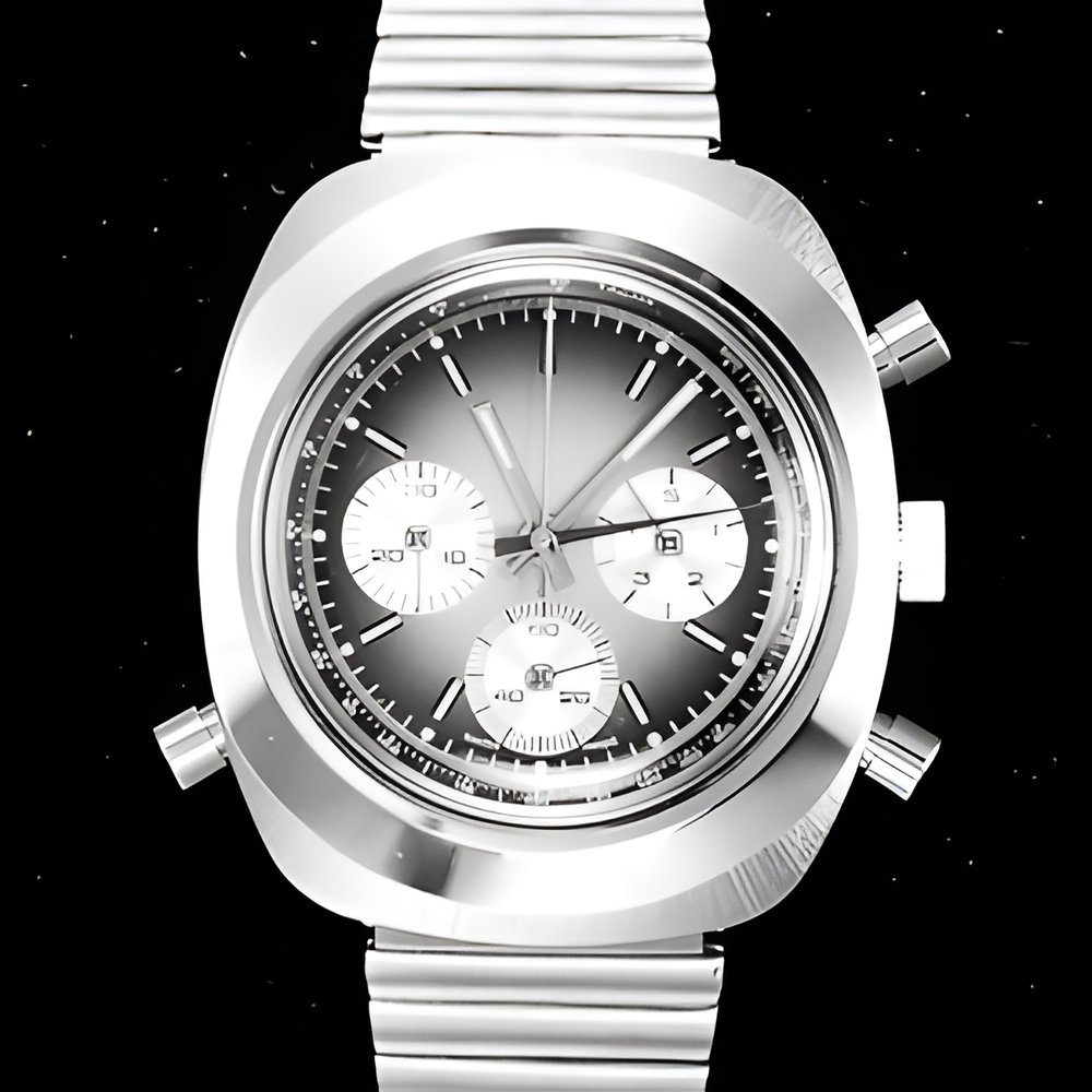 For young sports enthusiasts, an economical chronograph with short-time measurements of seconds, minutes and hours (up to 5). Tachymetric scale around the dial. A practical and easy-to-read instrument. (DOLMY)