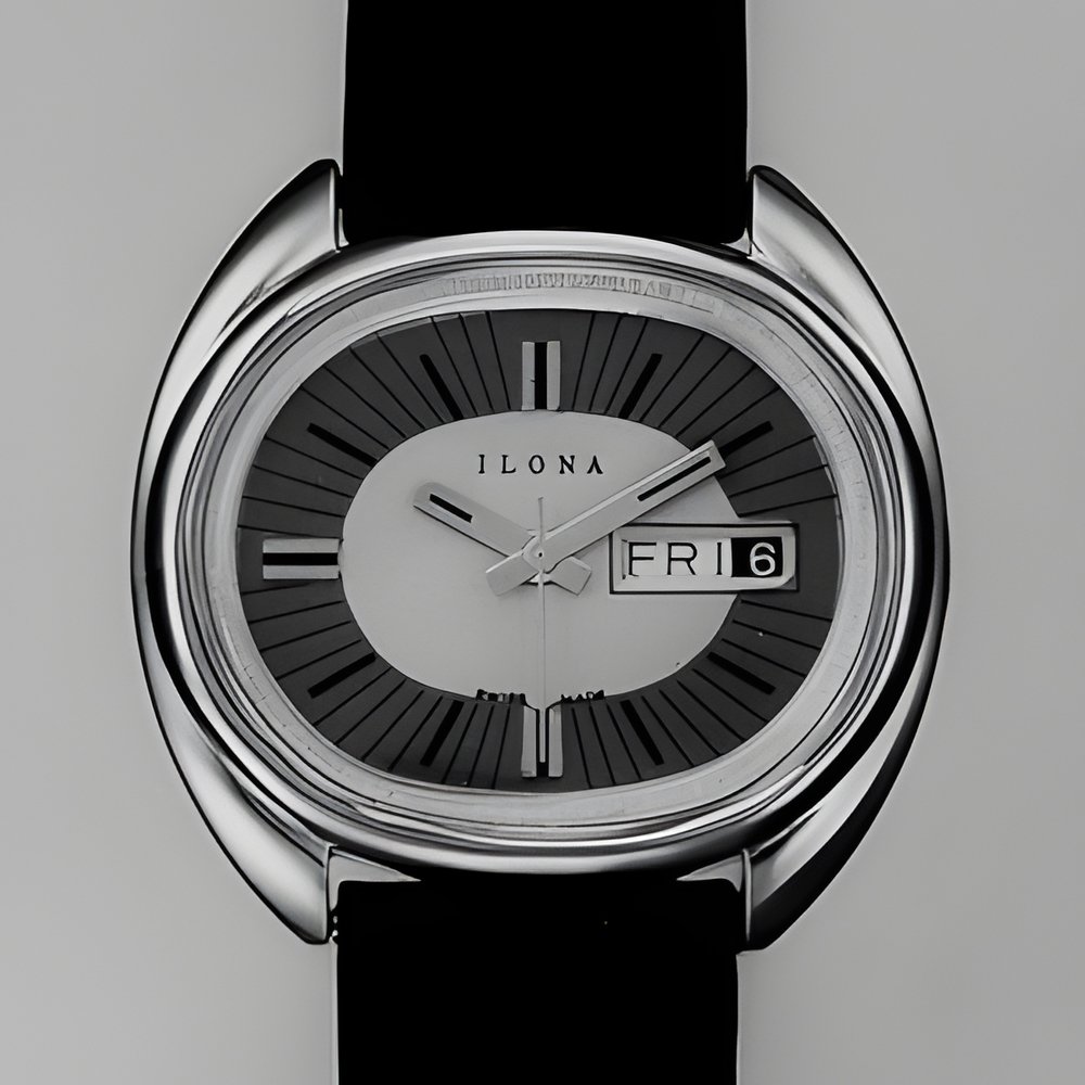 Man’s economical model with centre (sweep) second hand and day-date calendar. Fully polished gilt case. Colour zone dial. (ILONA)
