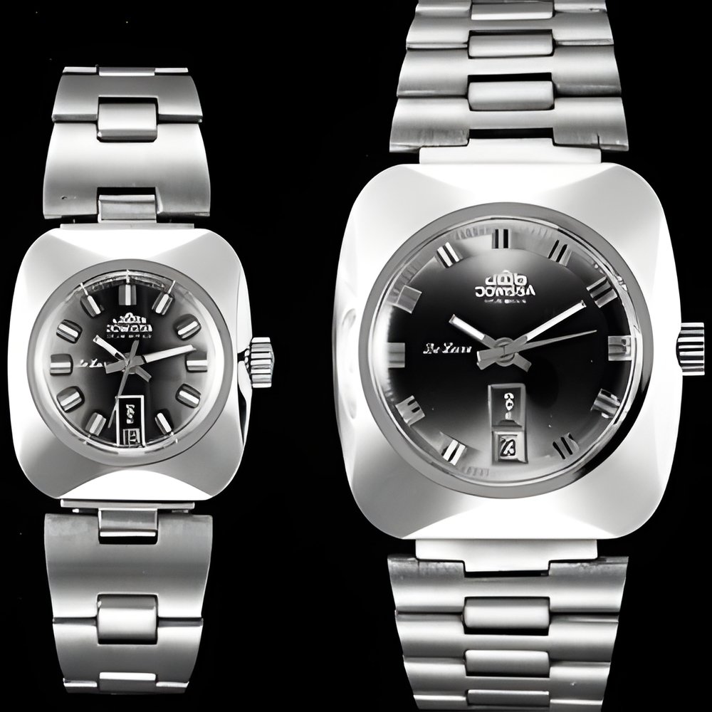 Paired watches are found in the economical watch class too Here, with very elegantly styled chromed cases (with screwed-in backs) and shaded dials. Calendar. Pin-lever movement. (JOWISSA)