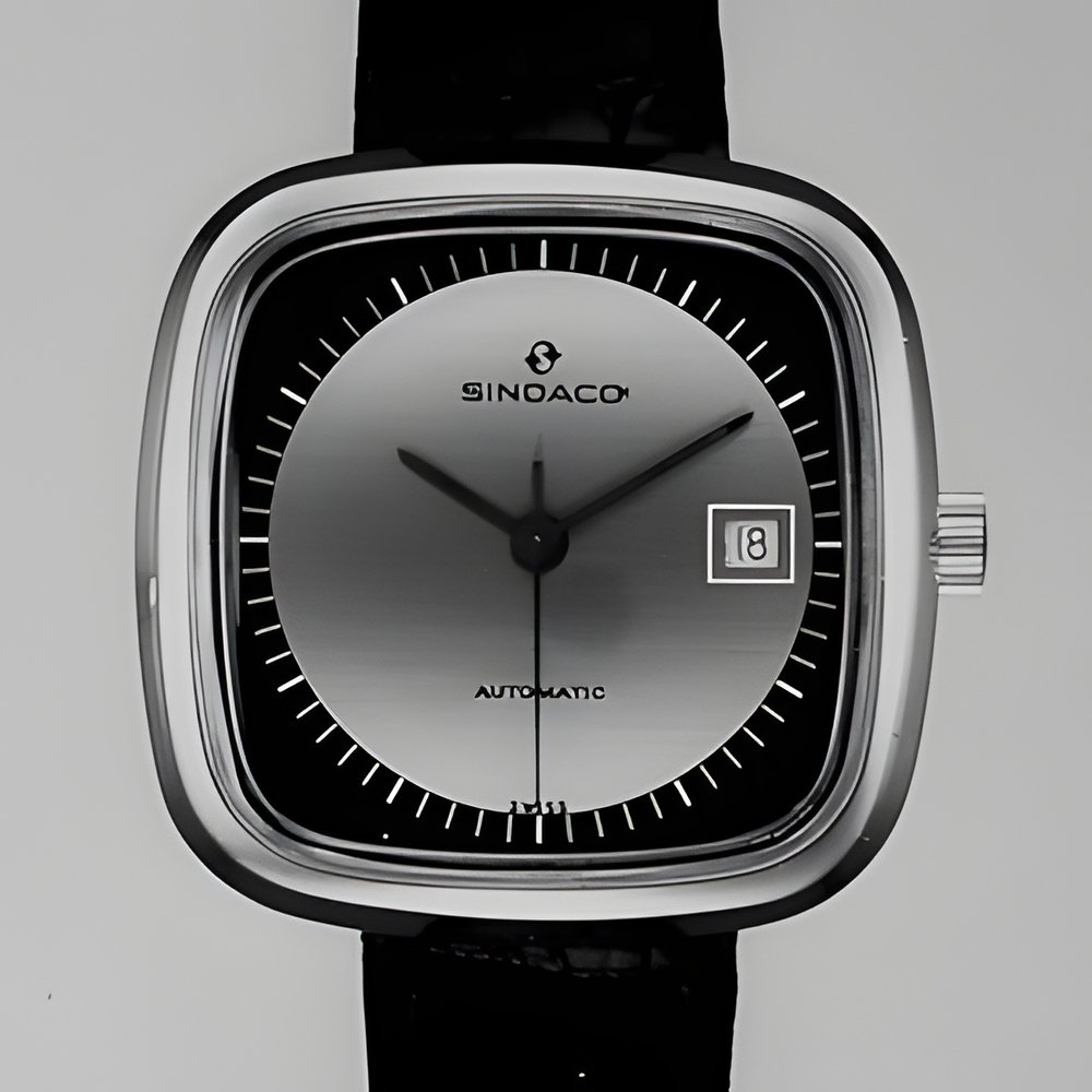 A handsomely styled economical model with neat, slightly rounded lines and calendar automatic movement. (SINDACO)