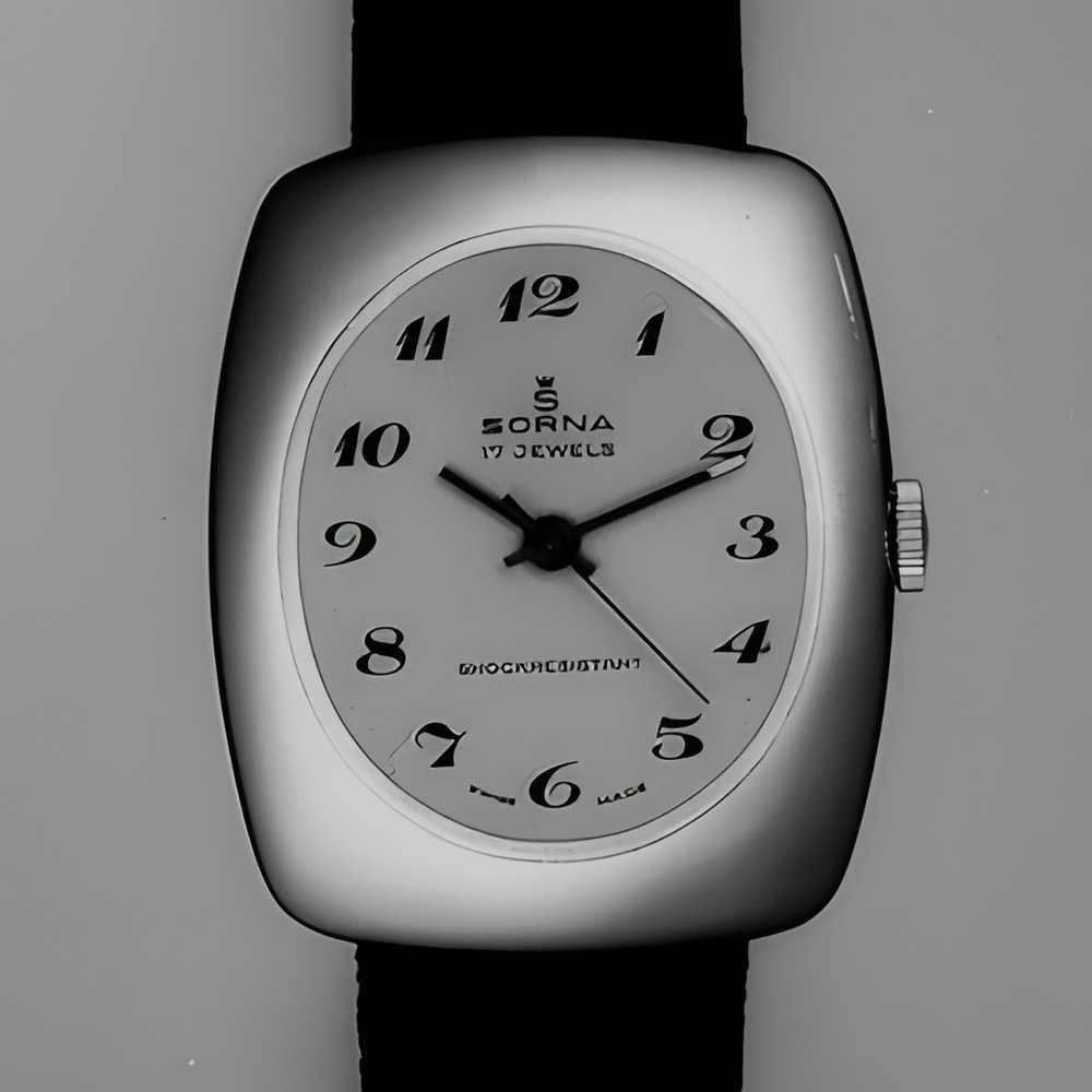 Matt green dial with Arab numerals, the latter making a strong comeback on youth-oriented models even as they become rarer on dress watches. Fully polished silvered case. An economical model by SORNA.