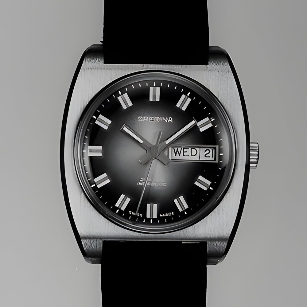 Man’s economical model with classic lines heralding a revival of straight lines. Round dial with shaded colours and “high rise” hour studs. Day and date calendar. (SPERINA)