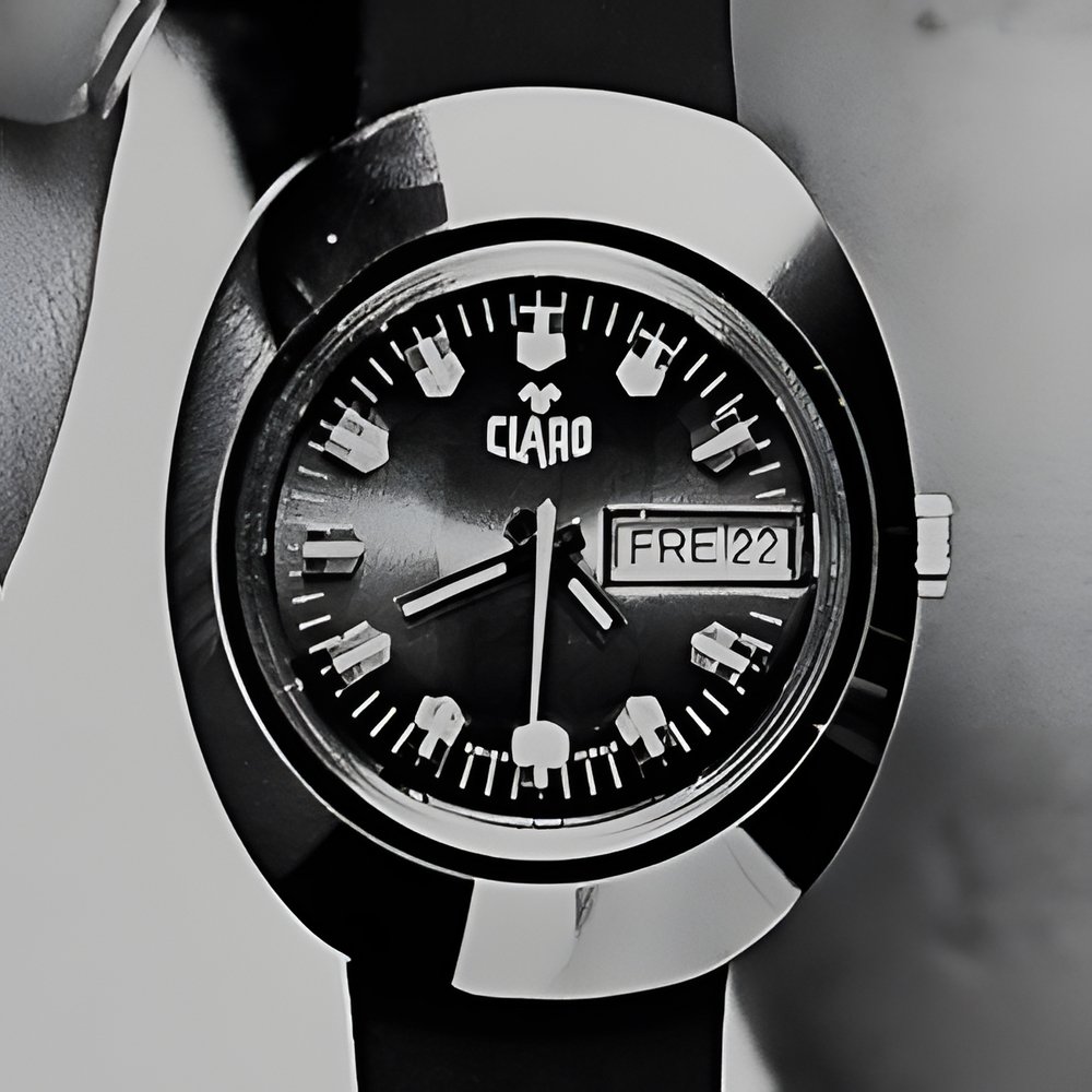 A chic though economical man’s watch with large, polished chromed case. High-rise hour markers and day-date calendar. (CLARO)