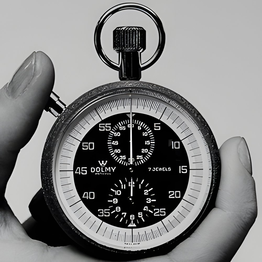 She is using a timer to the 1/5th second with 60-minute centre register and 12-hour register. An ideal instrument for timing sports events of every description. (DOLMY)