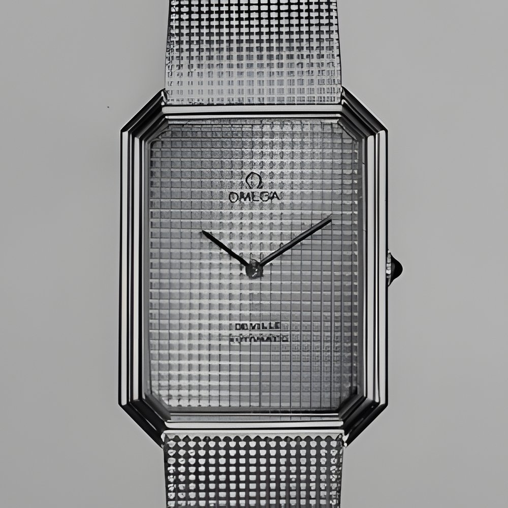 A very flat, selfwinding evening-wear model from Omega’s “St-Honoré” collection. Its austere elegance is enlivened by the case’ s cut corners and godroons. The “Clou de Paris” decor of the bracelet is repeated on the dial. In 18 carat yellow gold. (OMEGA)