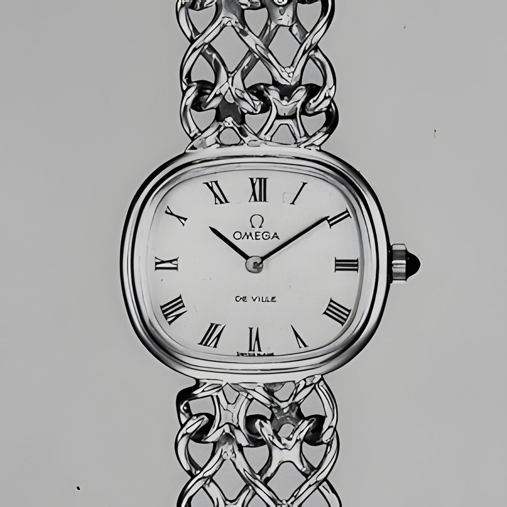 A strikingly elegant model in 925 silver. It is notable for its very supple chain bracelet, a sharp departure from the rigid types favoured until recently. As this watch shows, Roman numerals are coming back and cabochon-tipped crowns are still in style. (OMEGA “De Ville”)