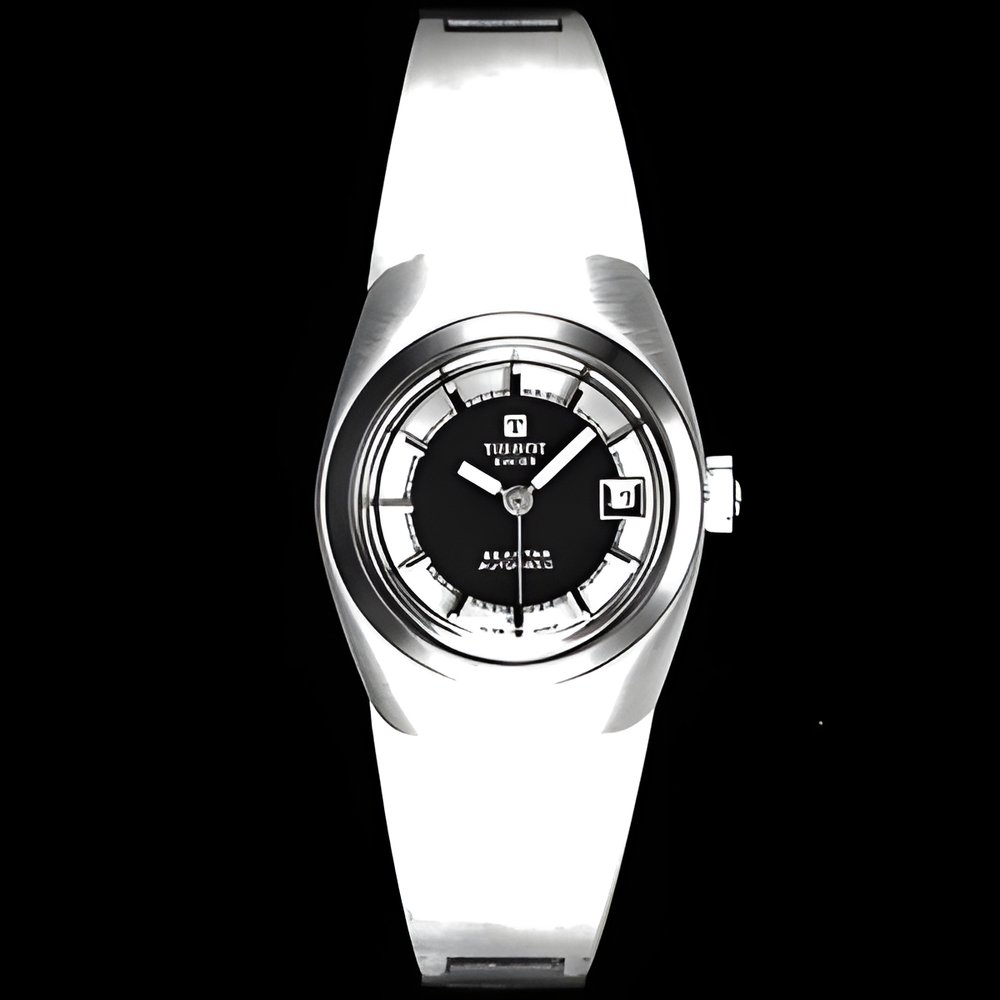 This Tissot Seastar lady’s model has a 28,800 v.p.h. fast-beat movement. Fitting snugly on the wrist, the case - water-resistant to 3 atm. - is prolonged by an integrated steel bracelet. Blue and grey dial with raised markers. (TISSOT - Seastar)